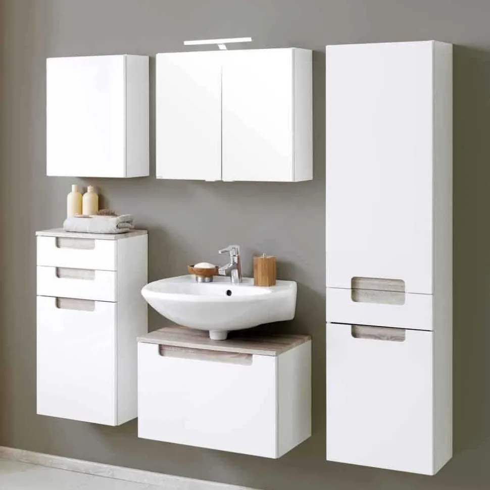 Ein Badezimmer, das Eleganz, Funktionalität und Wohlgefühl vereint – genau das verkörpert das Badezimmerset „Tymos“. Dieses hochwertige Ensemble umfasst einen Hängeschrank, einen Spiegelschrank, einen Hochschrank, einen Unterschrank sowie einen Waschbeckenunterschrank. In harmonischem Weiß Hochglanz mit eichefarbenen Absetzungen präsentiert sich dieses Set als moderner Blickfang, der Ihr Badezimmer in eine Oase der Ruhe und Ordnung verwandelt.