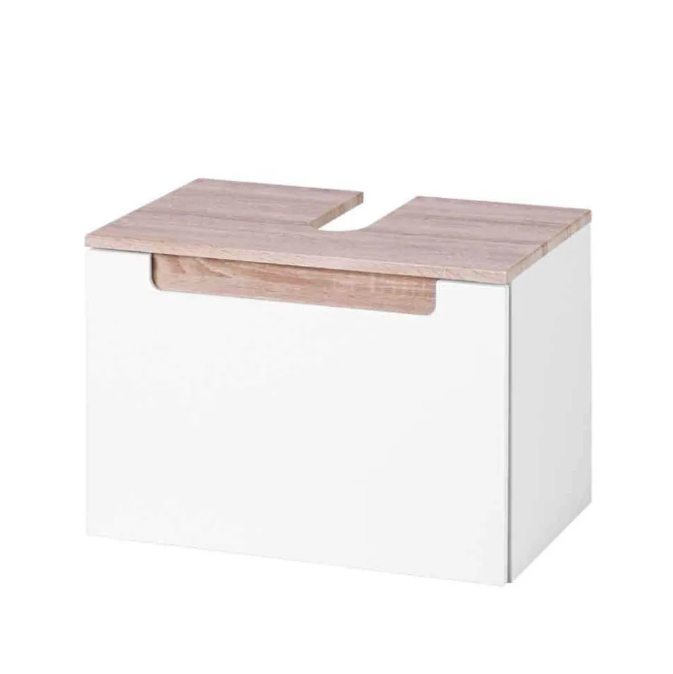 Auch der Unterschrank überzeugt mit funktionaler Aufteilung: eine Tür, zwei Schubladen und reichlich Stauraum für den täglichen Bedarf. Ergänzt wird das Ganze durch den Waschbeckenunterschrank mit einem großzügigen Auszug auf langlebigen Metall-Laufleisten. Ein präzise gearbeiteter Siphonausschnitt (ca. 8,1 x 19,5 cm) ermöglicht die problemlose Integration unter jedes gängige Waschbecken. Das Becken selbst ist nicht im Lieferumfang enthalten – so bleibt die Freiheit, ein Modell ganz nach persönlichem Geschmack zu wählen.