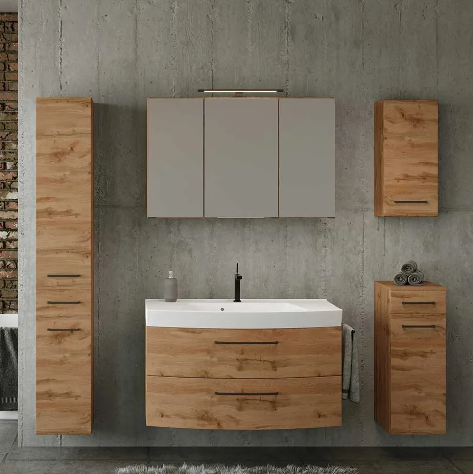 Korpus und Fronten bestehen aus robuster Spanplatte und MDF, die mit einer melaminbeschichteten Oberfläche in authentischer Wildeiche-Holzoptik veredelt wurden. Diese Melaminbeschichtung ist besonders strapazierfähig, pflegeleicht und schützt zuverlässig vor Feuchtigkeit – ideal für den Einsatz im Badezimmer. Die tiefgezogene Folierung der Front sorgt für eine nahtlose, edle Optik und verhindert das Eindringen von Wasser. Spiegelglas höchster Güte rundet das Gesamtbild ab und sorgt für ein helles, freundliches Raumgefühl.