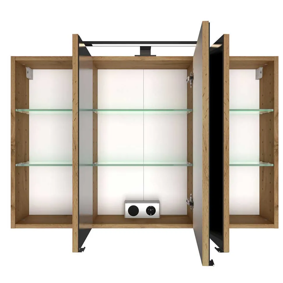 Der Spiegelschrank (100×67,5×20 cm) mit drei Türen, sechs verstellbaren Glasböden, Trafobox, Schalter und Steckdose ist ein wahres Raumwunder. Kleine Metallgriffe und eine hochwertige LED-Leuchte sorgen für Komfort und Stil.