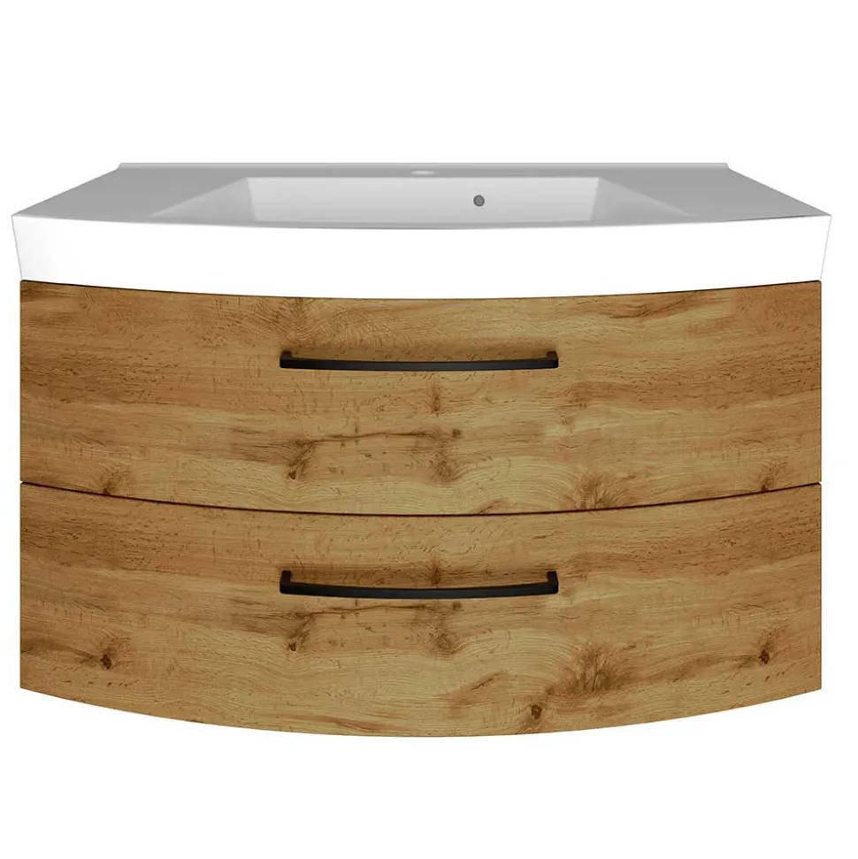 Der Waschtisch (100x60x50 cm) besticht durch seine elegante, gebogene Front und das edle Mineralgussbecken. Dieses wird inklusive Becken, aber ohne Armatur geliefert. Zwei Schubladen bieten ausreichend Platz für Badutensilien, während der obere Auszug einen praktischen Siphon-Ausschnitt besitzt.