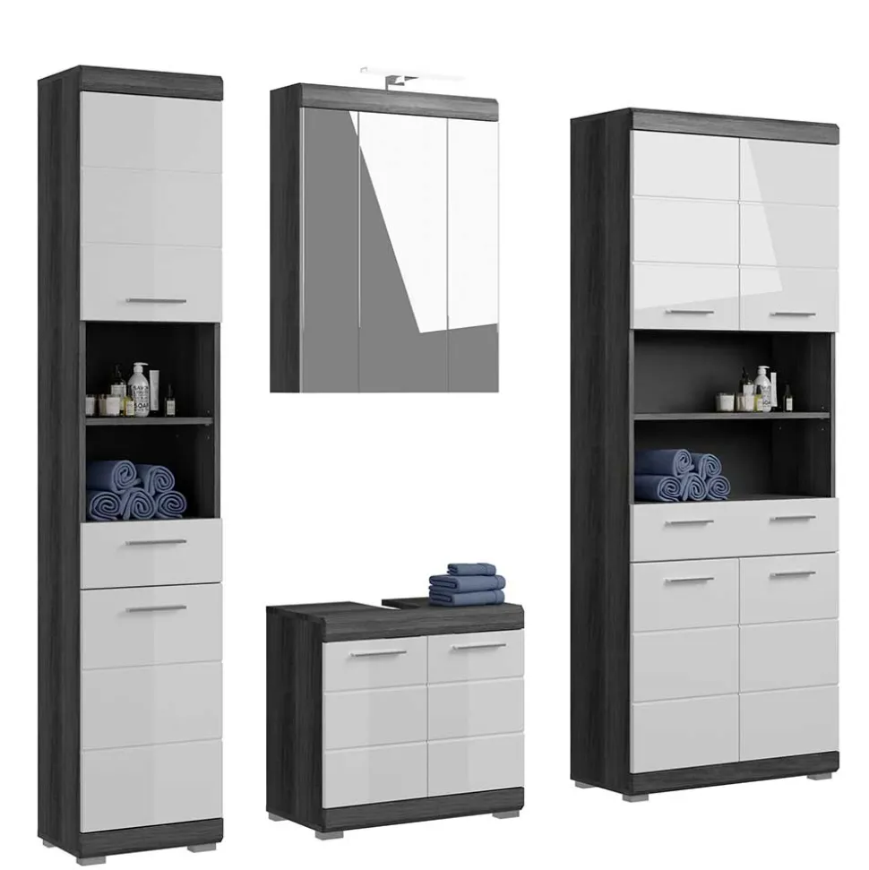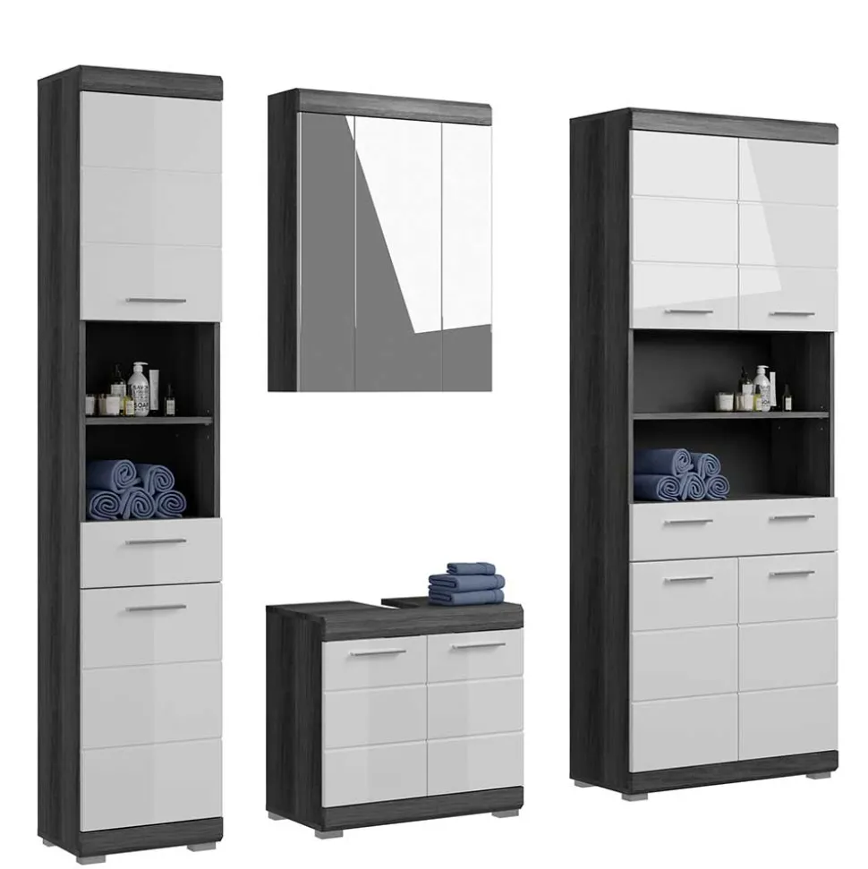Dieses vierteilige Set besteht aus einem Waschbeckenunterschrank, einem Spiegelschrank, einem breiten sowie einem schmalen Hochschrank – perfekt abgestimmt für ein aufgeräumtes, funktionales Bad.