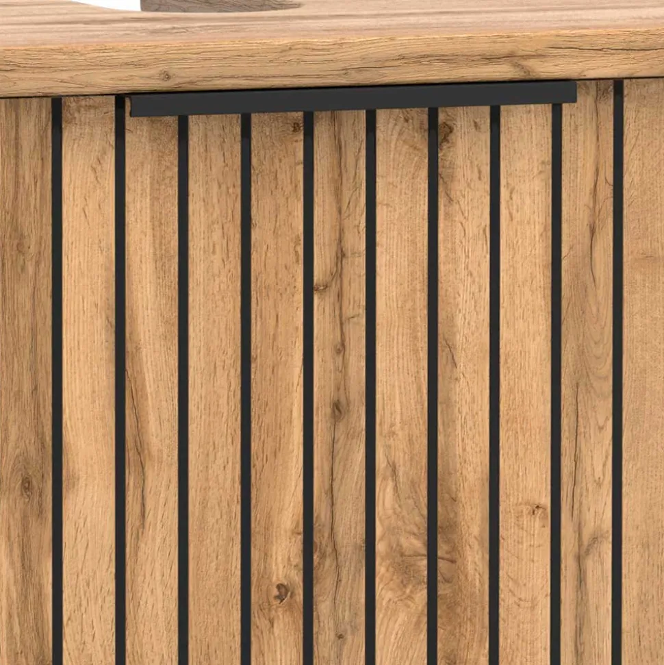 - Oberflächen pflegeleicht in Holzoptik Wildeiche melaminbeschichtet, Front in Rillenoptik mit schwarzem Untergrund gestaltet