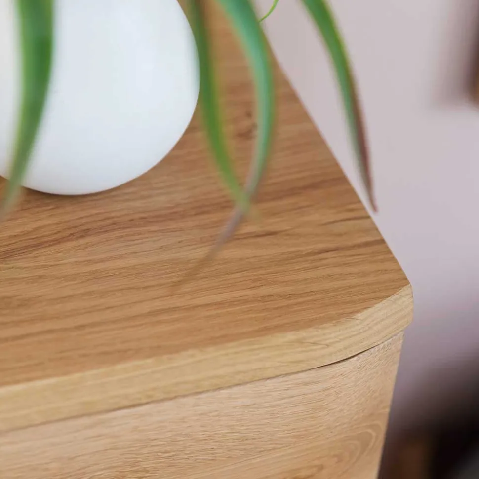 Diese Kommode ist aus massivem Eichenholz für die Front und hochwertiger Spanplatte für den Korpus gefertigt. Die Balkeneiche der Front ist in einem hellen Ölton gehalten, während der Korpus außen mit Eiche Echtholzfurnier in hellem Ölton und innen mit einem folierten Holzdekor in Eiche Bianco veredelt ist. Die Kombination dieser Materialien verleiht der Kommode nicht nur eine ansprechende Optik, sondern auch eine erstklassige Qualität.