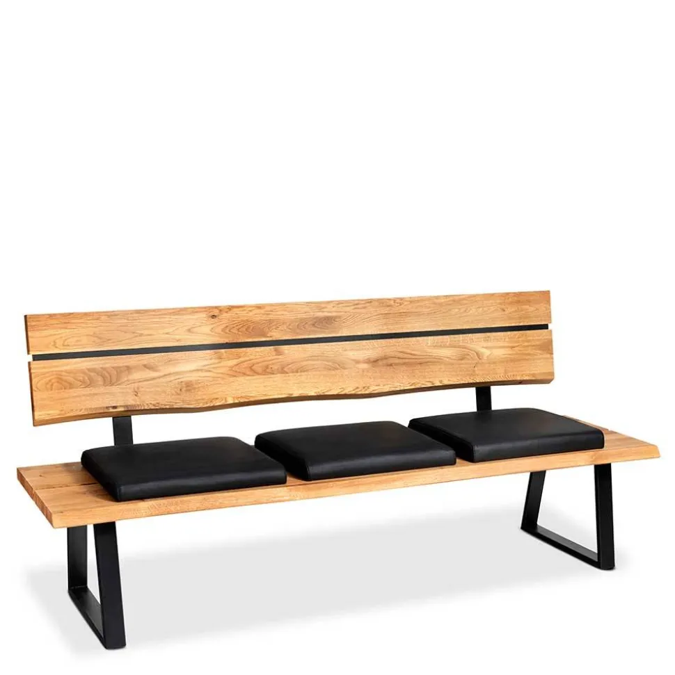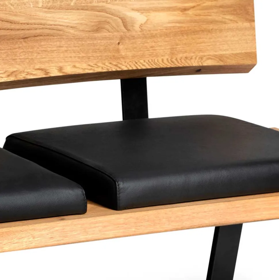 Die Bank „Jessmine“ überzeugt nicht nur durch ihr ansprechendes Äußeres, sondern auch durch die sorgfältige Auswahl der Materialien. Der Bezug besteht aus edlem schwarzen Echtleder, das in Kombination mit einer komfortablen Schaumstoffpolsterung für ein hervorragendes Sitzgefühl sorgt. Das Untergestell aus pulverbeschichtetem Metall in Schwarz garantiert Stabilität und Langlebigkeit. Die Holzoberfläche der Bank ist natürlich geölt, was die Struktur des Massivholzes hervorhebt und die Bank zu einem echten Unikat macht. Die organisch geformte Rückenlehne, die mit einem Hochdrucklaminateinsatz versehen ist, fügt sich harmonisch in das Gesamtbild ein und bietet gleichzeitig optimalen Halt.