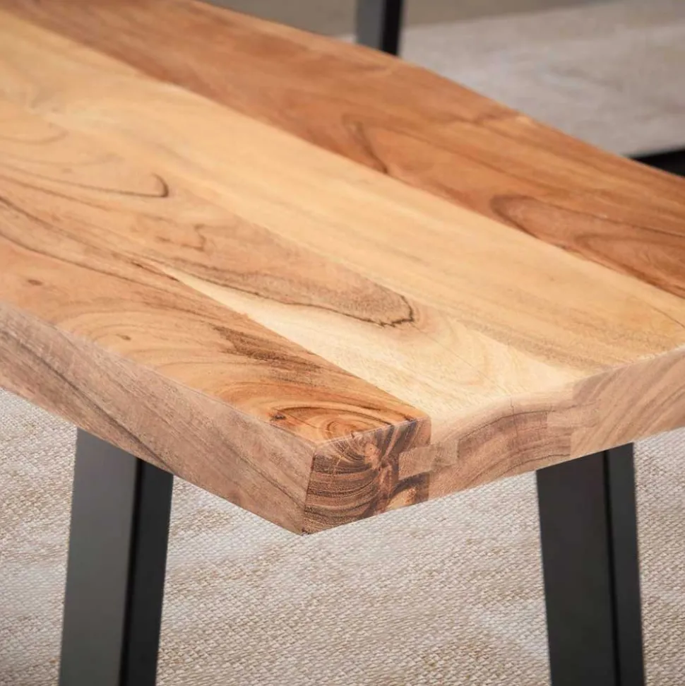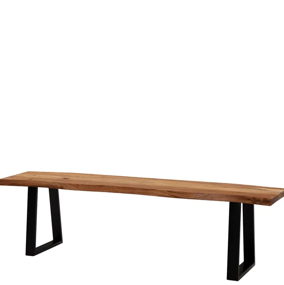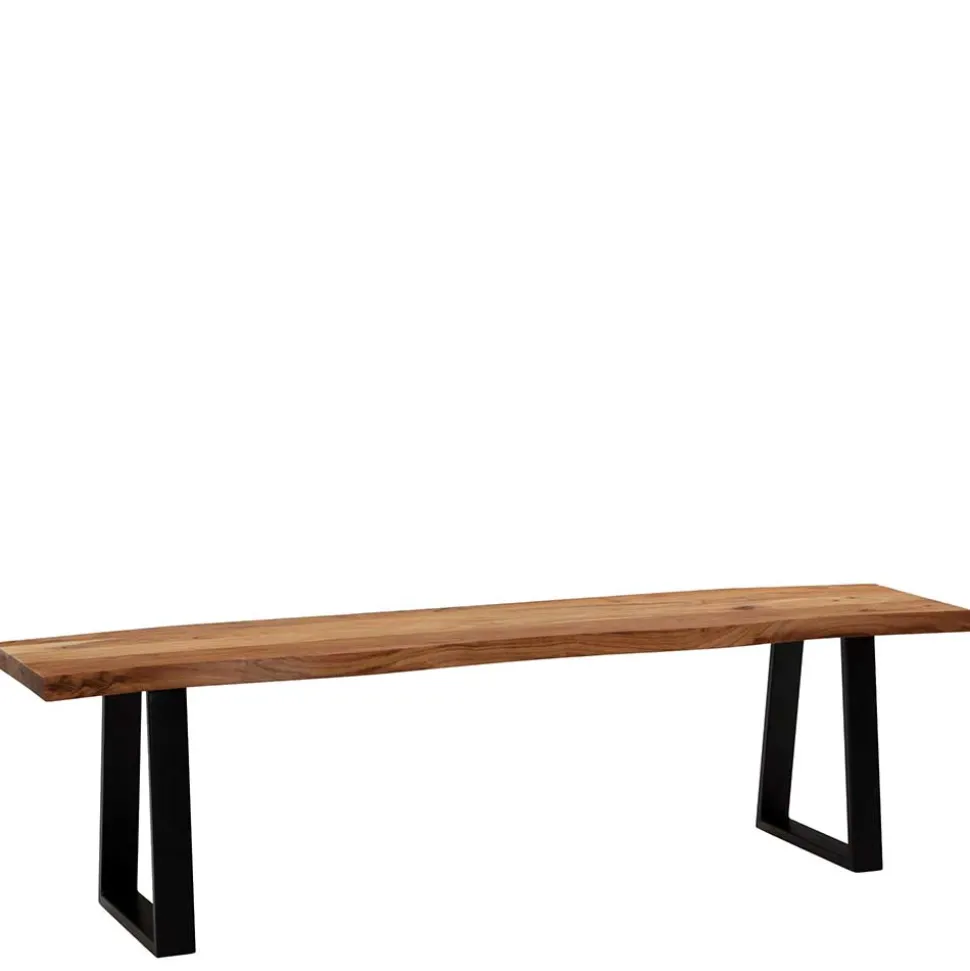 Die Sitzfläche der Bank besteht aus massivem Akazienholz, das nicht nur langlebig, sondern auch besonders pflegeleicht ist. Dank der schützenden Lackierung bleibt die Oberfläche strapazierfähig und behält ihre natürliche Schönheit für viele Jahre. Die charakteristische Baumkante macht jede Bank zu einem Unikat und sorgt für eine natürliche, organische Linienführung. Die stabilen Bügelbeine aus Metall in elegantem Schwarz bieten nicht nur sicheren Halt, sondern unterstreichen auch das moderne Design der Bank.