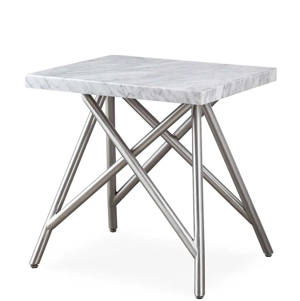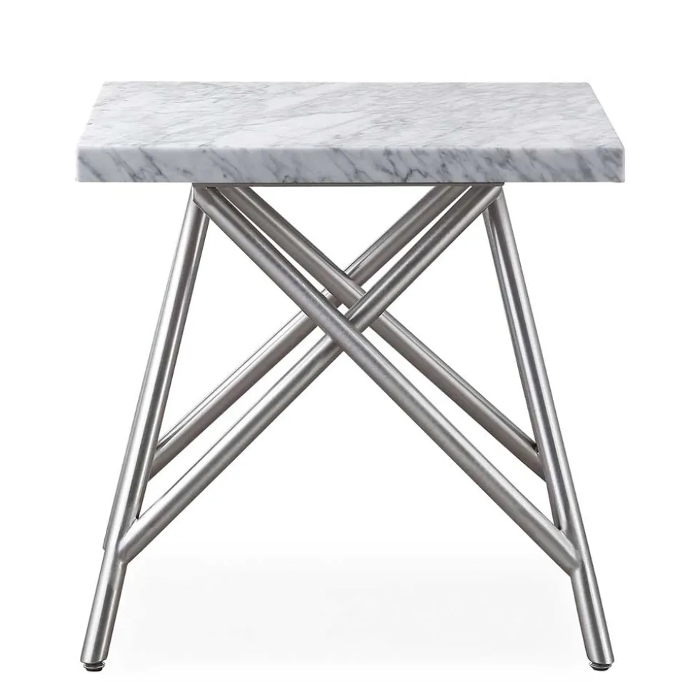 Das Design des Beistelltisches „Montao“ besticht durch seine klare Formensprache und die Kombination aus Marmor und Edelstahl. Das Vierfußgestell aus hochwertigen Edelstahlrohren ist nicht nur stabil, sondern auch ein echter Blickfang. Die gekreuzten Streben verleihen dem Tisch eine moderne Dynamik, die sich mühelos in jedes Interieur einfügt – ob im Wohnzimmer, im Schlafzimmer oder in Ihrem Büro.