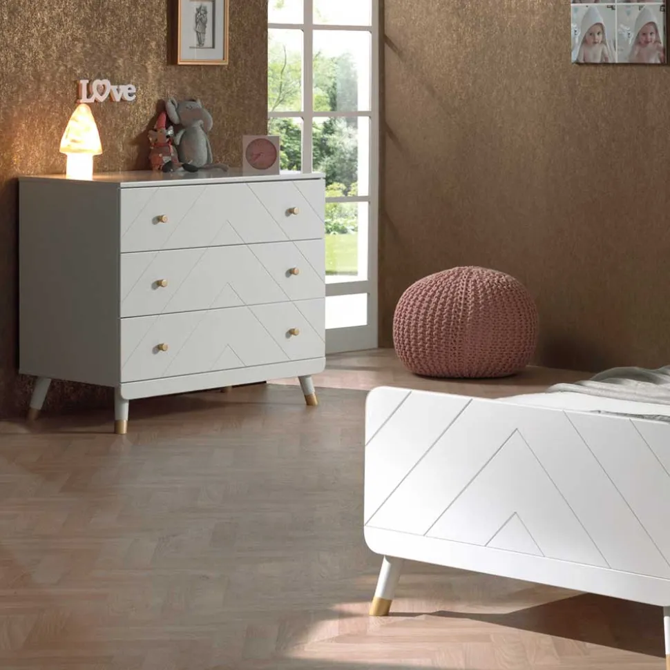 Diese dreiteilige Möbelkombination, bestehend aus Bett, Nachtkonsole und Kommode, wurde mit höchster Sorgfalt aus MDF-Platte gefertigt und verfügt über eine langlebige lackierte Oberfläche in Weiß. Die Möbelbeine sind mit eleganten Goldakzenten versehen, die perfekt zu den goldenen Kunststoffknopfgriffen passen. Qualität und Langlebigkeit sind hier selbstverständlich.