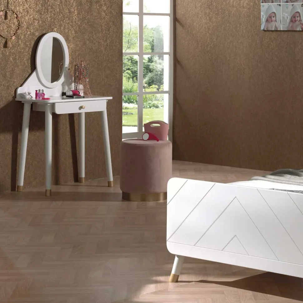 Dieses dreiteilige Möbelset, bestehend aus Bett, Nachttisch und Schminktisch, wurde sorgfältig aus MDF-Platte gefertigt und verfügt über eine hochwertige lackierte Oberfläche in Weiß. Die Möbelbeine zeichnen sich durch elegante goldfarbene Abschlüsse aus, die perfekt zu den goldenen Kunststoffknopfgriffen passen. Material und Verarbeitung überzeugen auf ganzer Linie.
