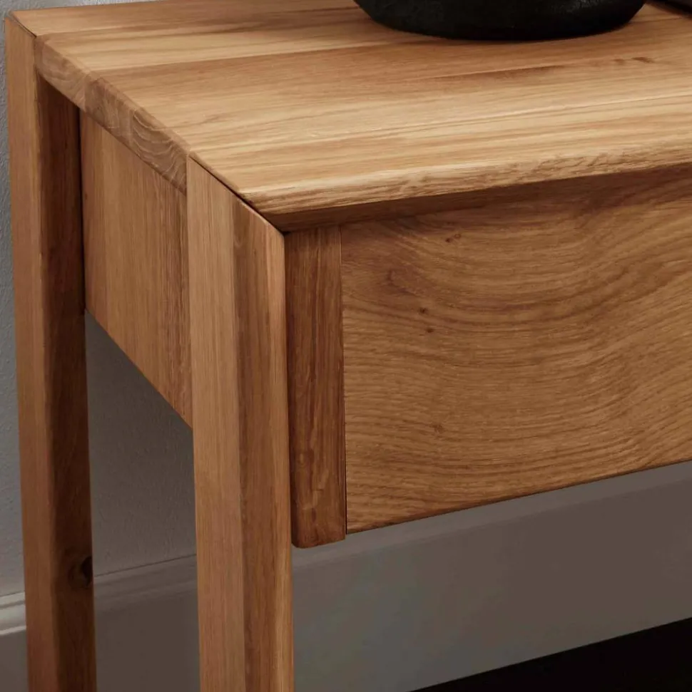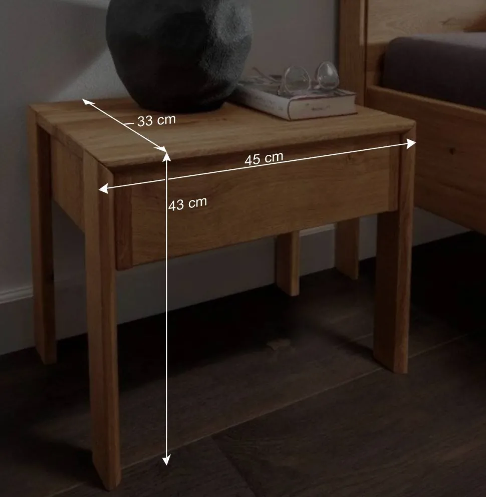 Zum Lieferumfang gehören zwei formschöne Nachtkommoden, ebenfalls aus massiver Wildeiche gefertigt. Mit den Maßen 45 cm Breite, 43 cm Höhe und 33 cm Tiefe bieten sie ausreichend Stauraum für persönliche Gegenstände. Jede Kommode verfügt über eine praktische Schublade und fügt sich durch ihr geradliniges Design perfekt an das Bettgestell an – ein harmonisches Gesamtbild, das Natürlichkeit und Funktion vereint.
