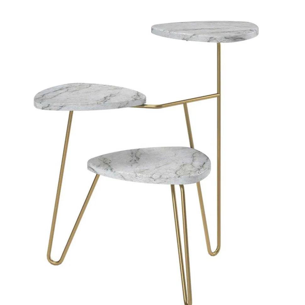 Der Blumenständer „Botanios“ ist aus strapazierfähiger Spanplatte und robustem Metall gefertigt. Die Platten in Wankelform auf drei Etagen präsentieren sich in edler Marmor Optik, die durch die dezente Rundung der Kanten zusätzlich an Charme gewinnt.