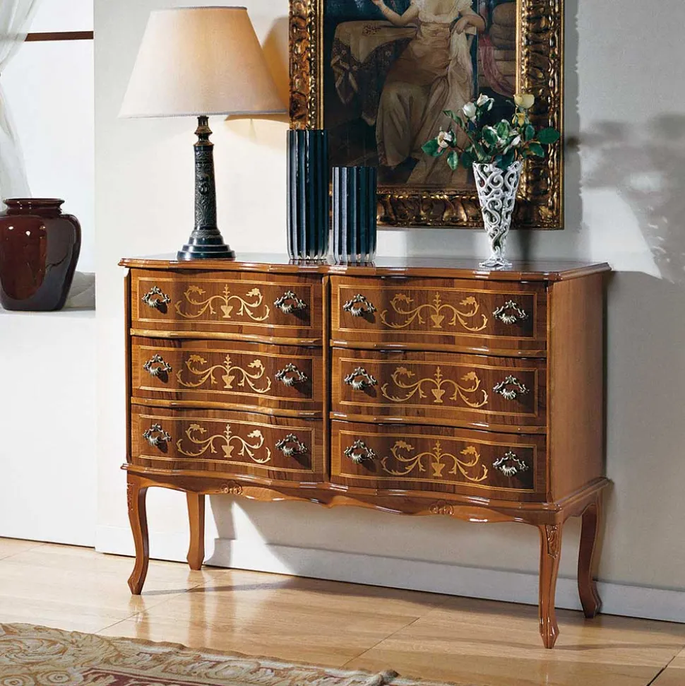 Unterstützt durch meisterhafte, florale Einlegearbeiten und gerundete Korpuskanten, setzt die Kommode „Agosto“ eindrucksvolle Akzente und sorgt für eine opulente Atmosphäre in Ihrem Wohnraum.
