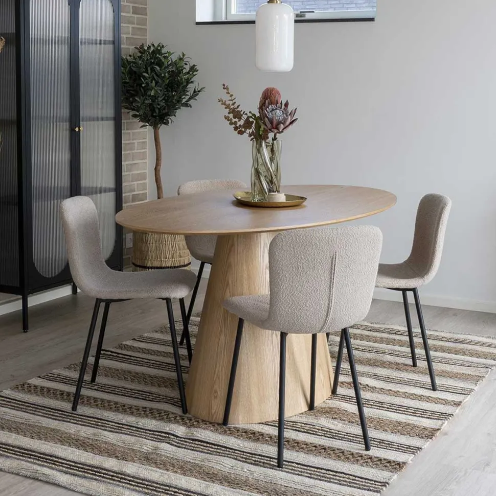 Der Stuhl „Menoria“ überzeugt durch seine ausgewählten Materialien: Der Bezug besteht aus 100% Polyester-Boucle, einem weichen, pflegeleichten und zugleich strapazierfähigen Stoff, der höchsten Sitzkomfort bietet. Die ergonomisch geformte Sitzschale mit einer komfortablen Rückenlehne und einer sanft abgerundeten Vorderkante lädt zum Verweilen ein. Das filigrane Gestell aus schwarzem Metall verleiht dem Stuhl nicht nur Stabilität, sondern auch eine moderne, schlanke Silhouette.