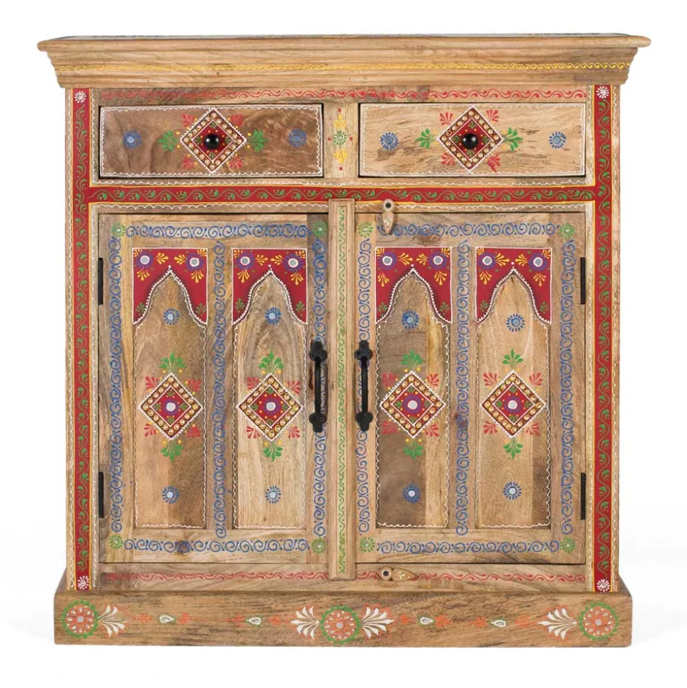 Die Kommode „Jalisa“ ist weit mehr als ein praktisches Möbelstück – sie ist ein ausdrucksstarkes Kunstwerk, das Ihrem Zuhause Charakter und Individualität verleiht. Gefertigt aus massivem Mangoholz, beeindruckt sie durch ihre außergewöhnliche Farbgestaltung und die handbemalten Oberflächen mit kunstvollen Ornamenten und Mustern. Jede Kommode ist ein Unikat, denn die Maserung, Farbtöne und Details variieren leicht und machen jedes Exemplar einzigartig. Ob im Wohnzimmer, Schlafzimmer oder Flur – „Jalisa“ setzt überall einen besonderen Akzent.