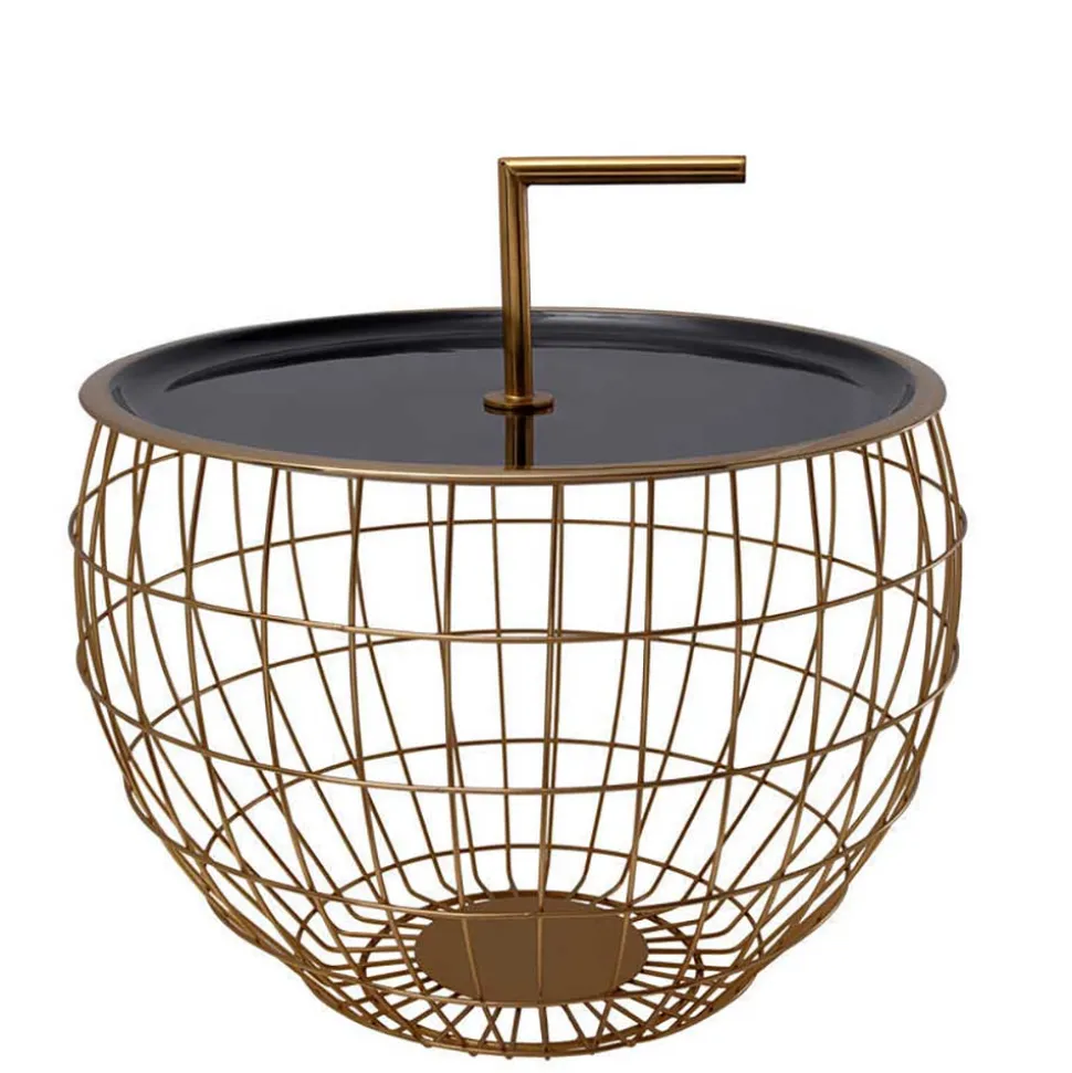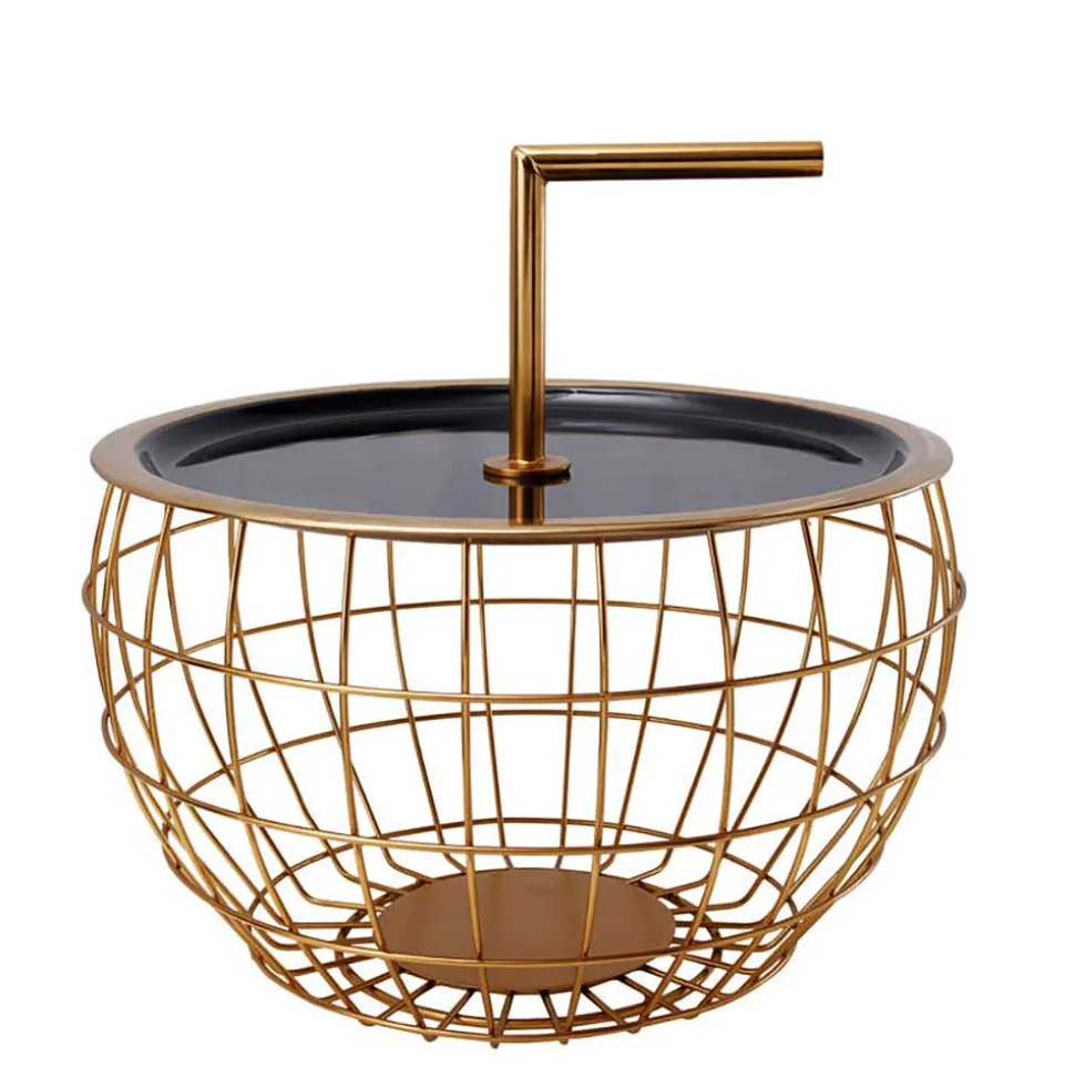 Der Design Beistelltisch „Egeass“ kombiniert innovative Formgebung mit einer stilvollen Materialwahl. Seine runde, abgesenkte Tischplatte in glänzendem Schwarz setzt einen eleganten Akzent, während das filigrane Drahtgestell in Gold für einen edlen und luftigen Look sorgt.