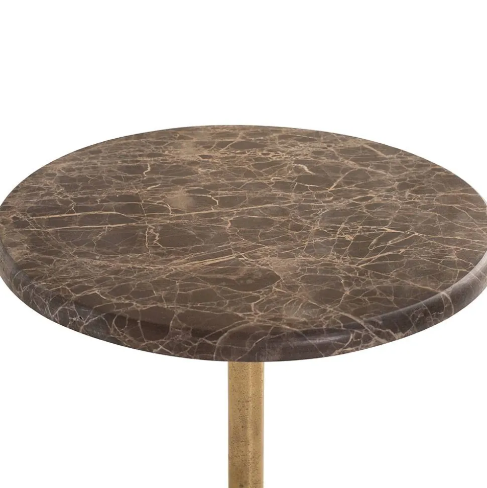Die Tischplatte aus braunem Marmor überzeugt nicht nur durch ihre edle Optik, sondern auch durch ihre langlebige und pflegeleichte Oberfläche. Das Metallgestell in glänzendem Gold sorgt für Stabilität und eine luxuriöse Ausstrahlung. Die harmonische Kombination der Materialien macht den Beistelltisch „Luvenicos“ zu einem Blickfang, der Qualität und Design perfekt verbindet.