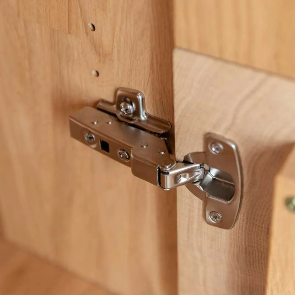 Drei Drehtüren mit langlebigen Metallbeschlägen und Soft-Close-Funktion machen die Bedienung besonders komfortabel und leise. Hinter den Türen bieten zwei Einlegeböden großzügigen Stauraum für all Ihre Utensilien – von Geschirr bis hin zu persönlichen Gegenständen. Die gelungene Kombination aus Funktionalität und Design macht dieses Sideboard zu einem vielseitigen Möbelstück, das sowohl praktisch als auch dekorativ ist.