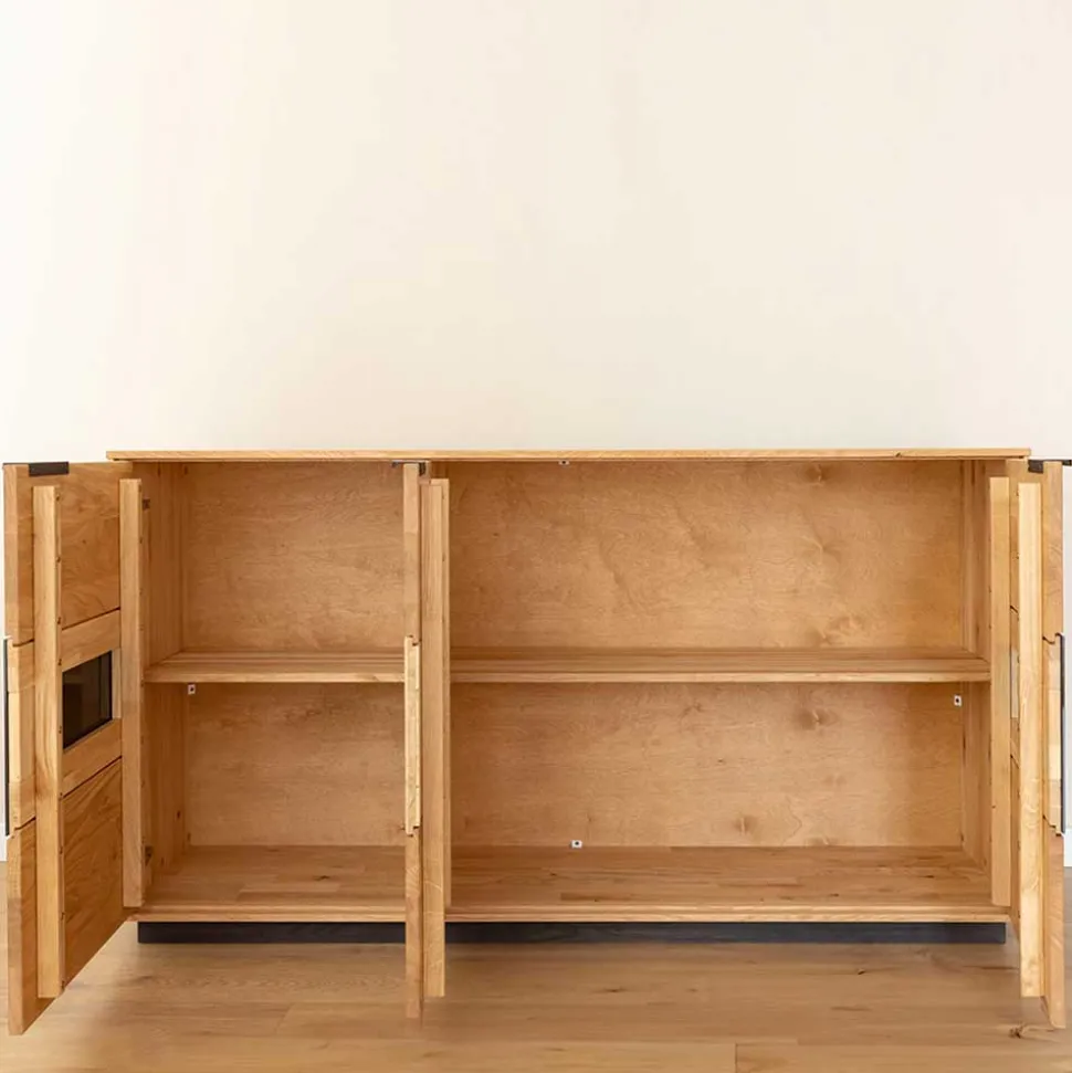 Das Sideboard „Masicuri“ überzeugt durch die erstklassige Verarbeitung hochwertiger Materialien. Die Holzoberflächen aus massivem Eichenholz sind geölt, wodurch die natürliche Maserung besonders schön zur Geltung kommt. Ergänzt wird das Design durch schwarze Glas-Elemente, die die edle Ästhetik des Möbels unterstreichen. Der Sockel aus schwarzem Holz und die dezenten, schwarzen Kantengriffe aus Metall sorgen für zusätzliche Stabilität und Stil.