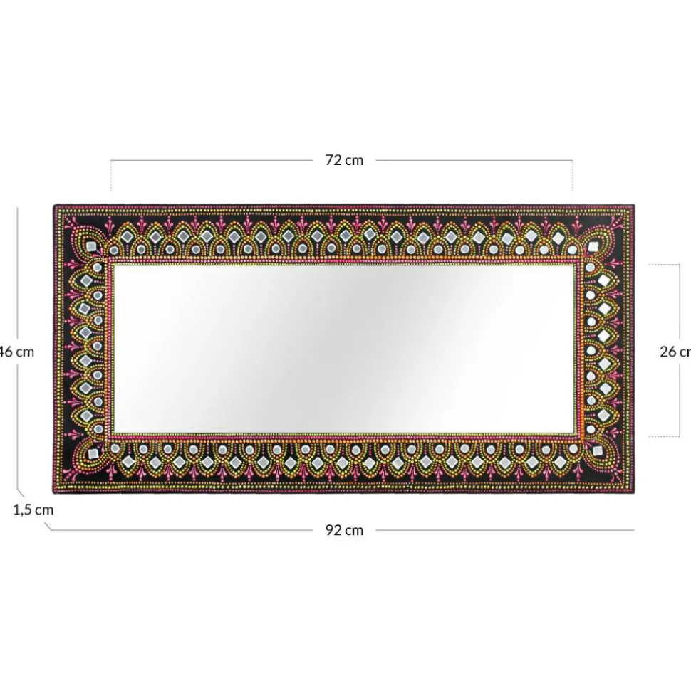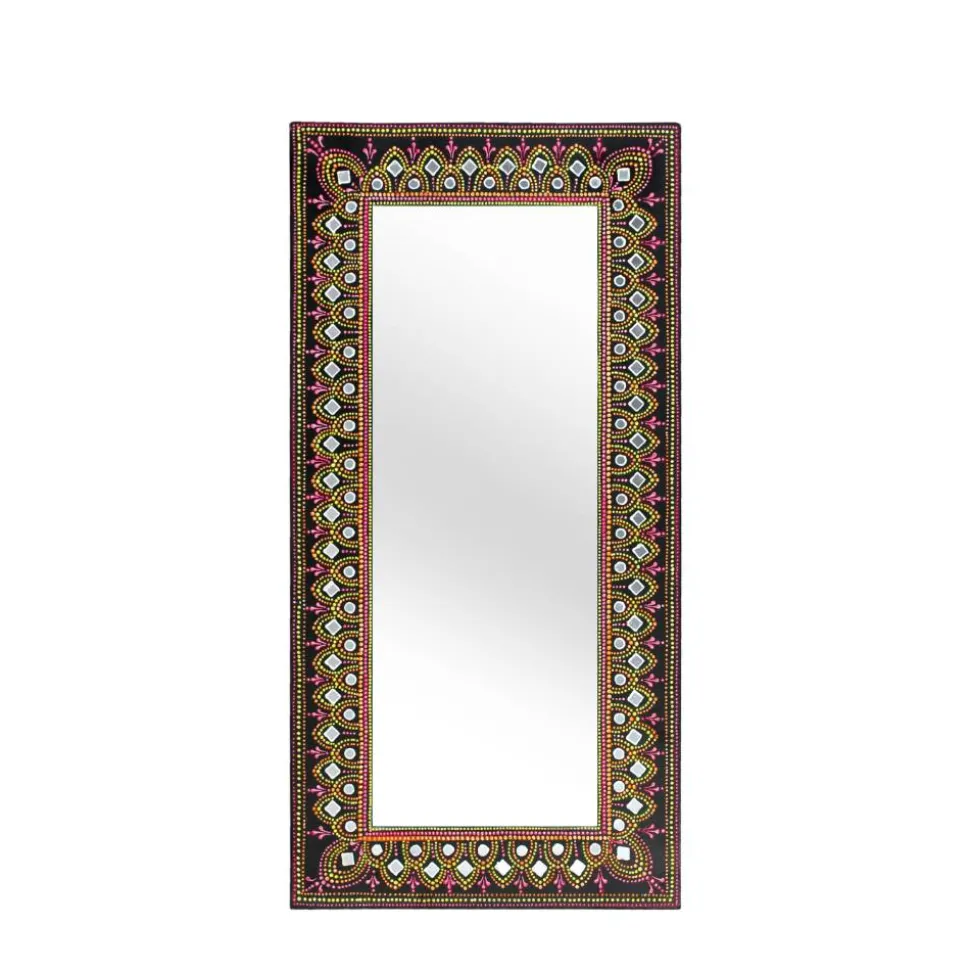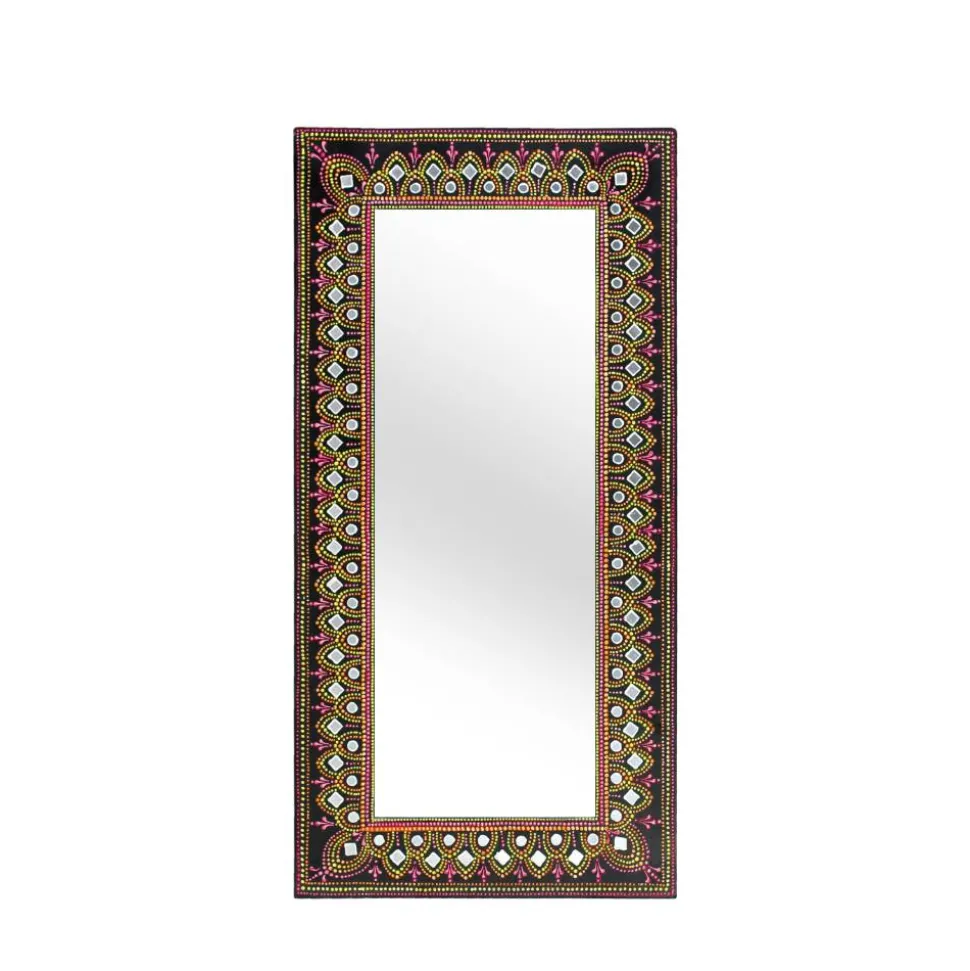 Der Design Spiegel „Noro“ ist weit mehr als nur ein funktionales Wohnaccessoire – er ist ein kunstvolles Highlight, das Ihrem Zuhause Charakter und Lebendigkeit verleiht. Mit seinem farbenfrohen, handbemalten Rahmen wird er zum echten Hingucker und bringt eine spielerische Leichtigkeit in jeden Raum. Die dunkle Basisfarbe des Rahmens bildet dabei einen wirkungsvollen Kontrast zu den strahlenden Tönen von Pink, Gelb, Orange, Weiß und Silber, die kunstvoll in das Design eingearbeitet wurden. Ob im Flur, Schlafzimmer oder Wohnzimmer – dieser Spiegel setzt dekorative Akzente und bereichert besonders Einrichtungen im Boho-Stil.