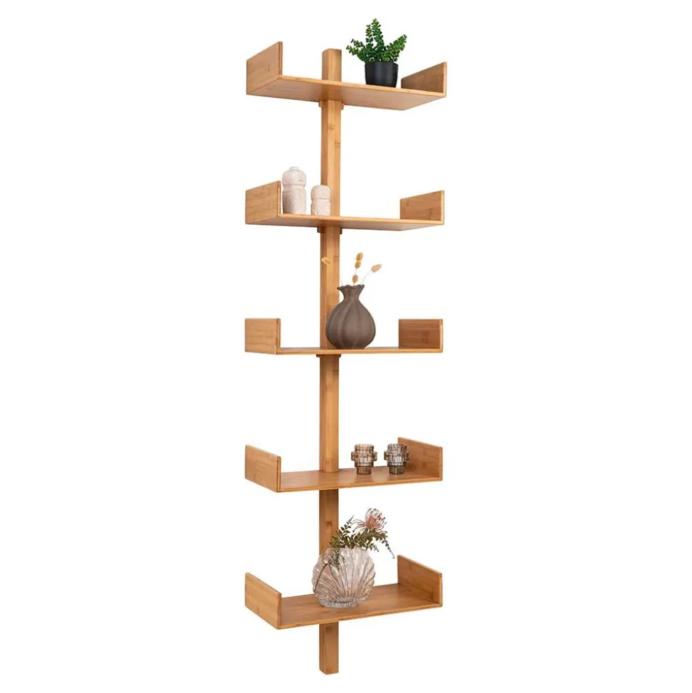 Bambus, das Hauptmaterial des Wandregals, ist nicht nur für seine Stabilität und Langlebigkeit bekannt, sondern auch für seine umweltfreundlichen Eigenschaften. Die Oberflächen des Regals sind pflegeleicht und behalten auch bei regelmäßiger Reinigung ihre natürliche Schönheit. Die fünf Ablageböden sind durch eine vertikale Leiste miteinander verbunden und bieten ausreichend Platz für Ihre Lieblingsdeko, Bücher oder kleine Pflanzen. Seitliche Begrenzungen an den linken und rechten Seiten der Ablagen sorgen dafür, dass Ihre Gegenstände sicher auf ihrem Platz bleiben.