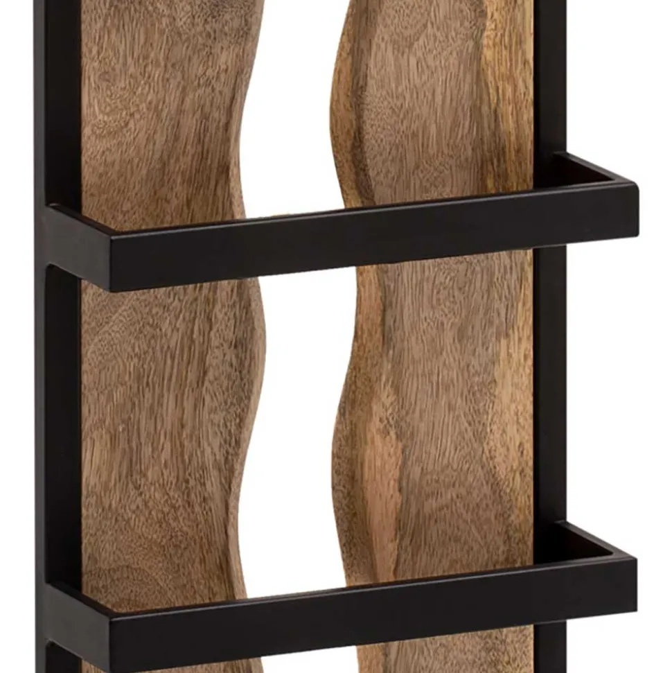 Das Design Wandregal „Heraklion“ vereint geradlinige Moderne mit rustikaler Natürlichkeit und kühlem Industrial Charme. Die zweifarbige Kombination aus natürlichem Mango-Holz und schwarzem Metall schafft eine faszinierende Optik, die in jedem Raum zum Blickfang wird. Mit seiner rechteckigen Grundform und den kreativen, wellenförmigen Aussparungen an der Rückwand bringt das Regal eine einzigartige Ästhetik in Ihr Zuhause.