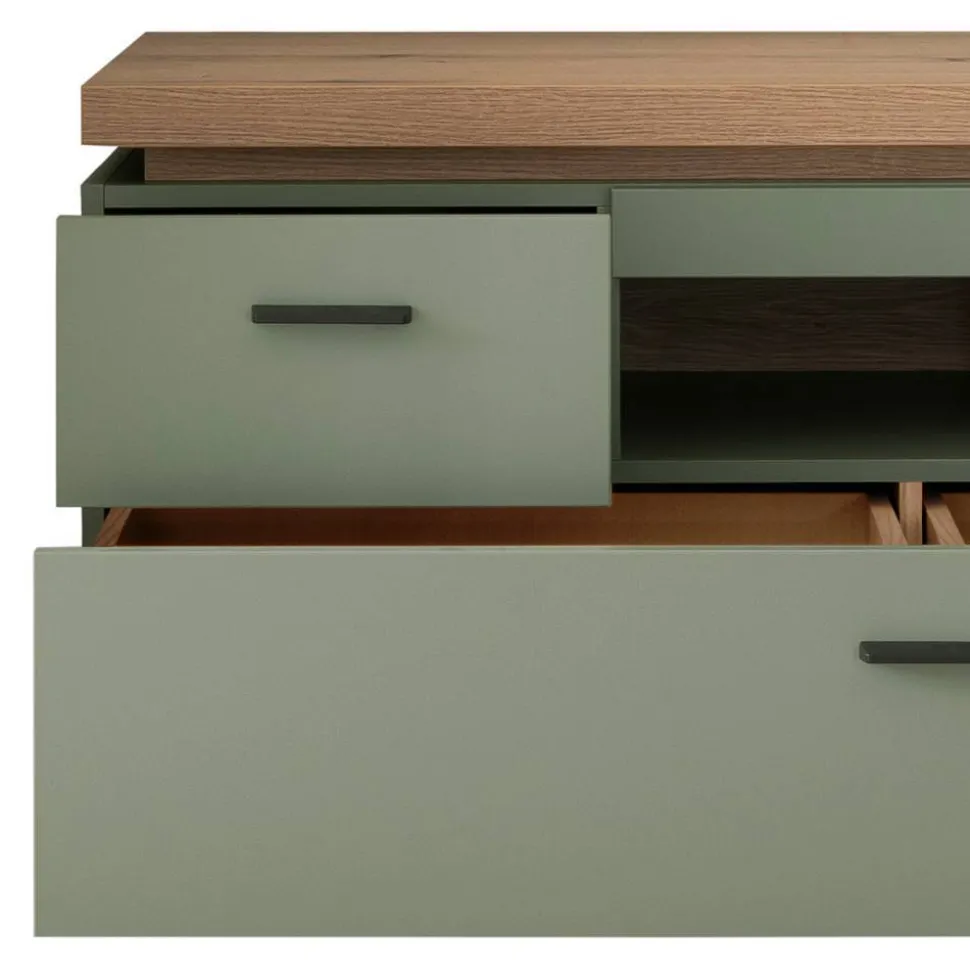 Das großzügige TV-Board (156 x 57 x 44 cm) bietet Platz für Fernseher bis 60 Zoll und begeistert mit zwei praktischen Schubladen samt Soft-Close-Funktion, einer zusätzlichen Tür mit Einlegeboden sowie zwei offenen Gerätefächern. Die Deckplatte trägt bis zu 50 kg – genug für große TV-Modelle oder stilvolle Dekoobjekte.