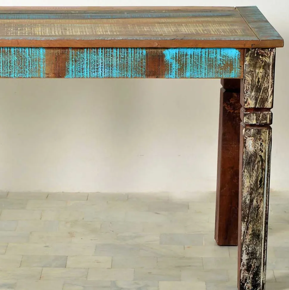 Die Oberfläche des Esstisches „Jamaica“ ist kunstvoll in verschiedenen Farben lackiert und mit Farbresten verziert. Dies verleiht dem Tisch eine lebendige und dynamische Ausstrahlung, die jeden Raum aufhellt. Der Kontrast zwischen den Farben und den Gebrauchsspuren des Holzes sorgt für ein einzigartiges visuelles Erlebnis, das Ihr Zuhause bereichert.