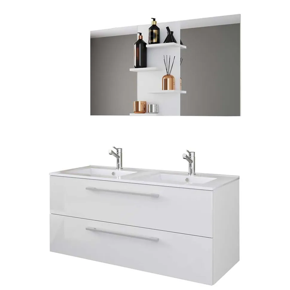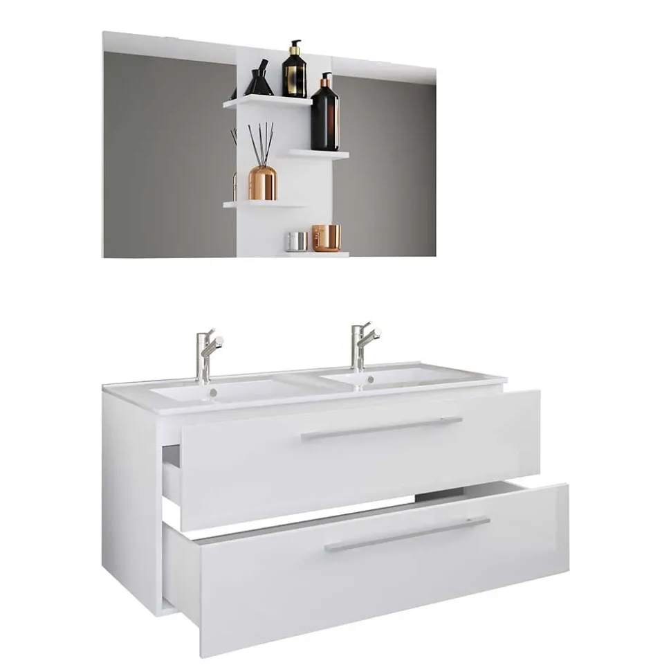 Das Badmöbel Set „Matsu“ besteht aus einem großzügigen Spiegel und einem praktischen Waschtisch mit Doppelwaschbecken. Dank der hochwertigen Verarbeitung und des durchdachten Designs entsteht eine harmonische Einheit, die sowohl optisch als auch funktional überzeugt.