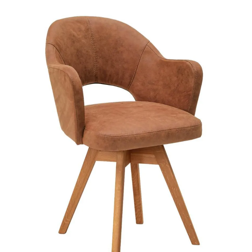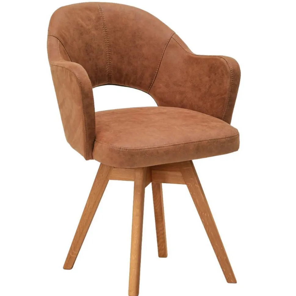 Der drehbare Armlehnenstuhl „Finallo“ bringt mit seiner Kombination aus warmem Cognacbraun und edlen Wildeichefarben eine behagliche Atmosphäre in Ihren Ess- oder Wohnbereich. Durch seine ausgewogene Formensprache und den dekorativen Ausschnitt in der Rückenlehne fügt er sich stilvoll in moderne Einrichtungen ein und sorgt für eine einladende Sitzgelegenheit, die Funktionalität und Design harmonisch vereint.