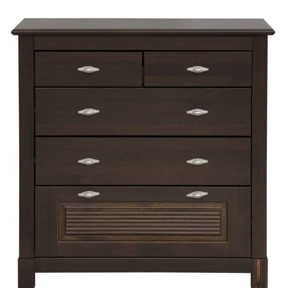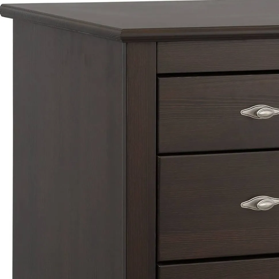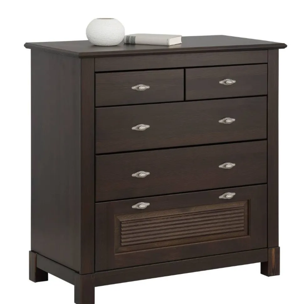 Die dunkelbraune Lackierung verleiht der Kommode eine elegante Tiefe, während die durchscheinende Holzmaserung für eine spürbare Natürlichkeit sorgt. Dieses Wechselspiel zwischen Farbe und Struktur macht „Sikulav“ zu einem Blickfang in jedem Raum – edel, aber nicht aufdringlich. Es ist ein Möbelstück, das nicht nur optisch beeindruckt, sondern auch durch seine subtile Wärme einladend wirkt.