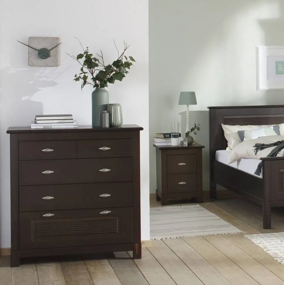 Mit einer Breite von 96 cm, einer Höhe von 99 cm und einer Tiefe von 38 cm bietet die Kommode großzügigen Stauraum auf kompakter Fläche. Die überstehende Deckplatte setzt einen stilvollen Akzent, während das plastisch gefräste Rillendekor im unteren Frontbereich der Kommode Tiefe und Raffinesse verleiht. Die fünf Schubladen laufen auf hochwertigen Metallauszügen – sanft, leise, zuverlässig. In den ovalen Metall-Knopfgriffen in Altsilberfarben spiegelt sich der nostalgische Charme des Landhausstils wider.