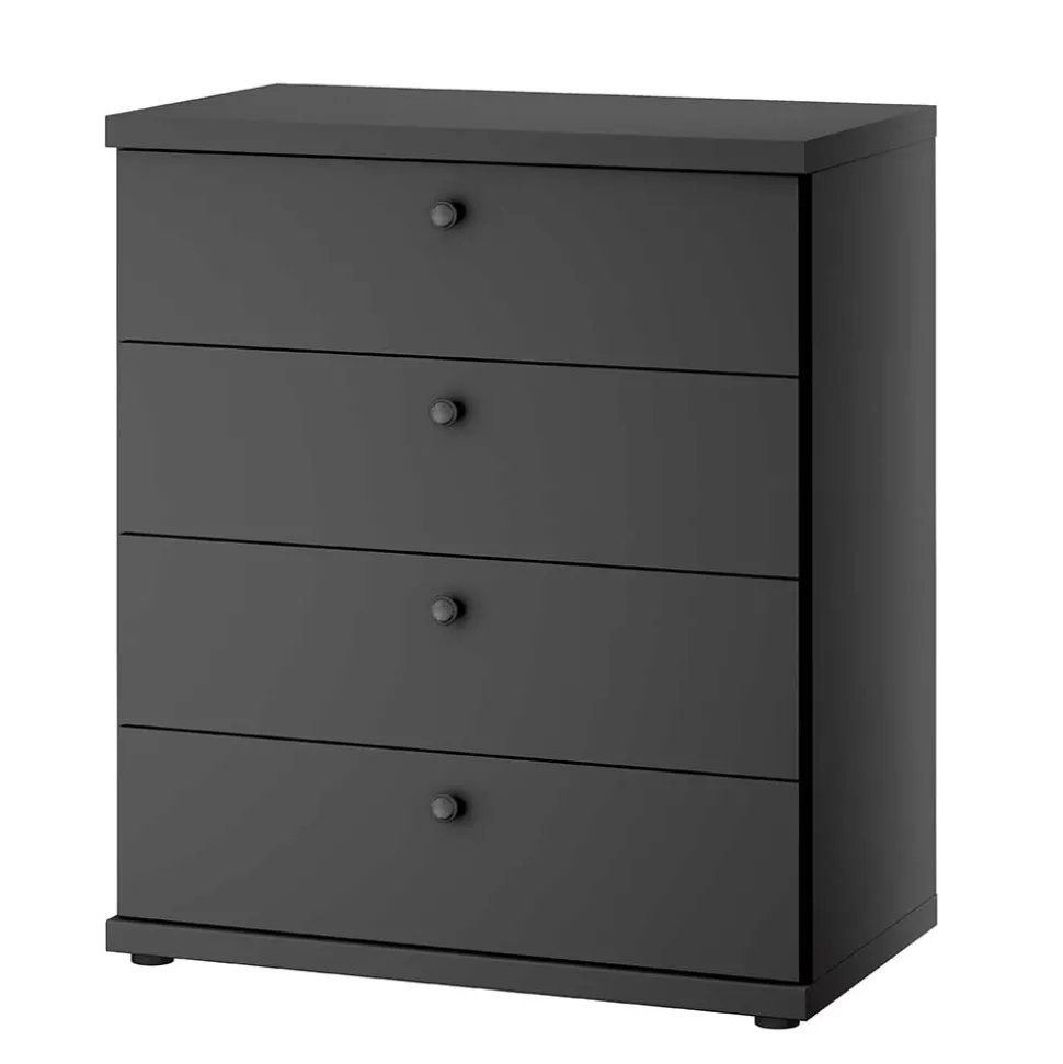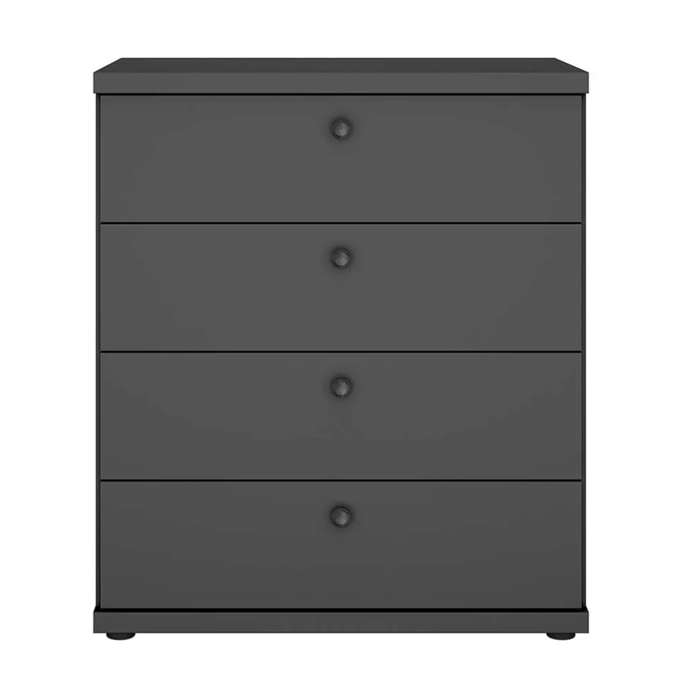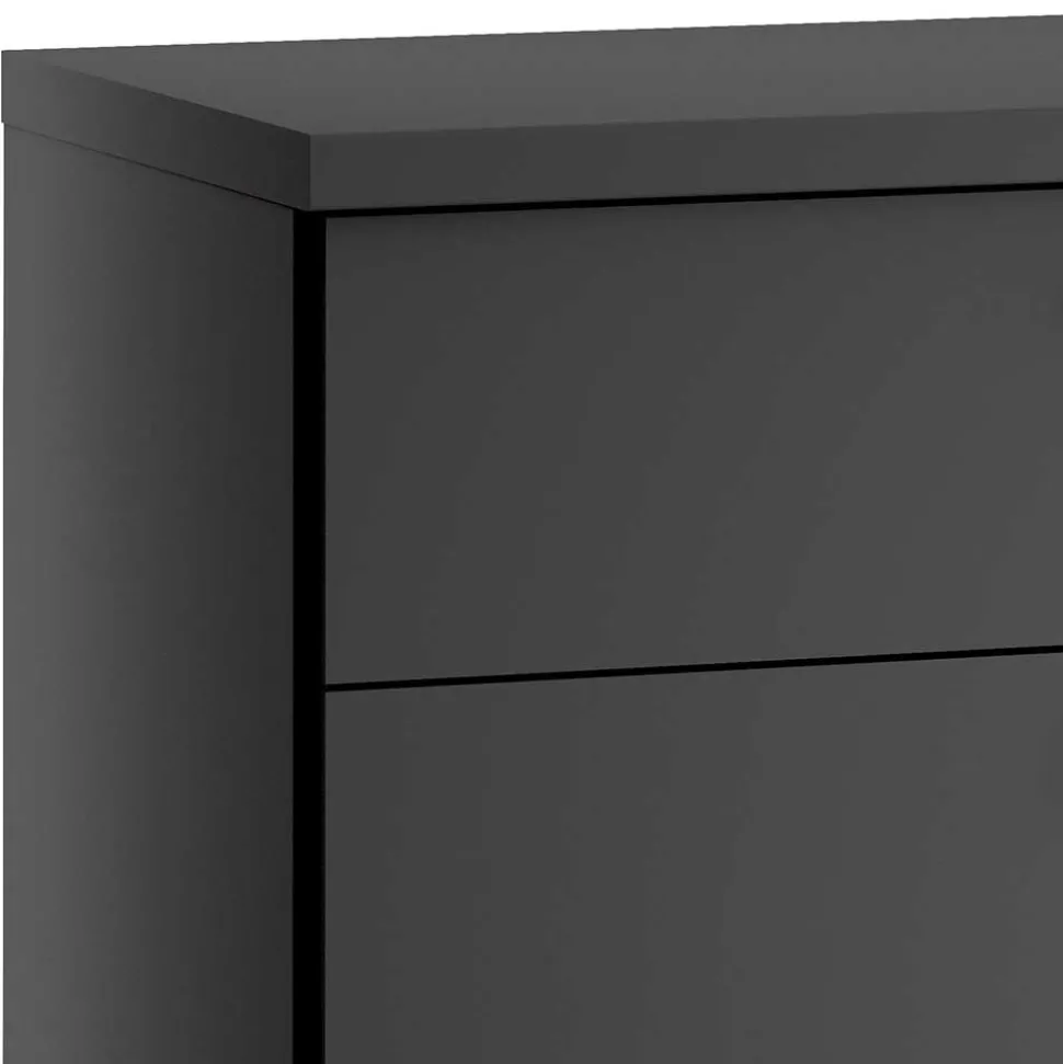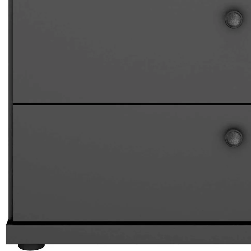 Das Dunkelgrau der pflegeleicht folierten Oberflächen ist nicht nur besonders ansehnlich, sondern auch praktisch. Folierungen schützen das Holz vor Abnutzungen und sind zugleich leicht zu reinigen. Ein feuchtes Tuch genügt meistens, um die Kommode wieder strahlen zu lassen.