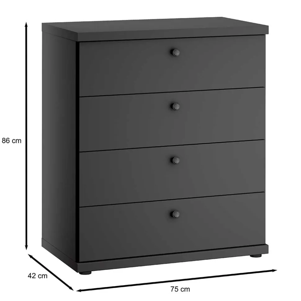 Mit den Maßen von 75 cm Breite, 86 cm Höhe und 42 cm Tiefe bietet die Kommode reichlich Stauraum. Die vier geräumigen Schubladen sind mit einem Metallauszug ausgestattet. Dies sorgt nicht nur für eine elegante Optik, sondern auch für eine leichtgängige und langlebige Funktion. Abgerundet wird das Design durch runde Knopfgriffe aus Metall in Altsilberfarben.