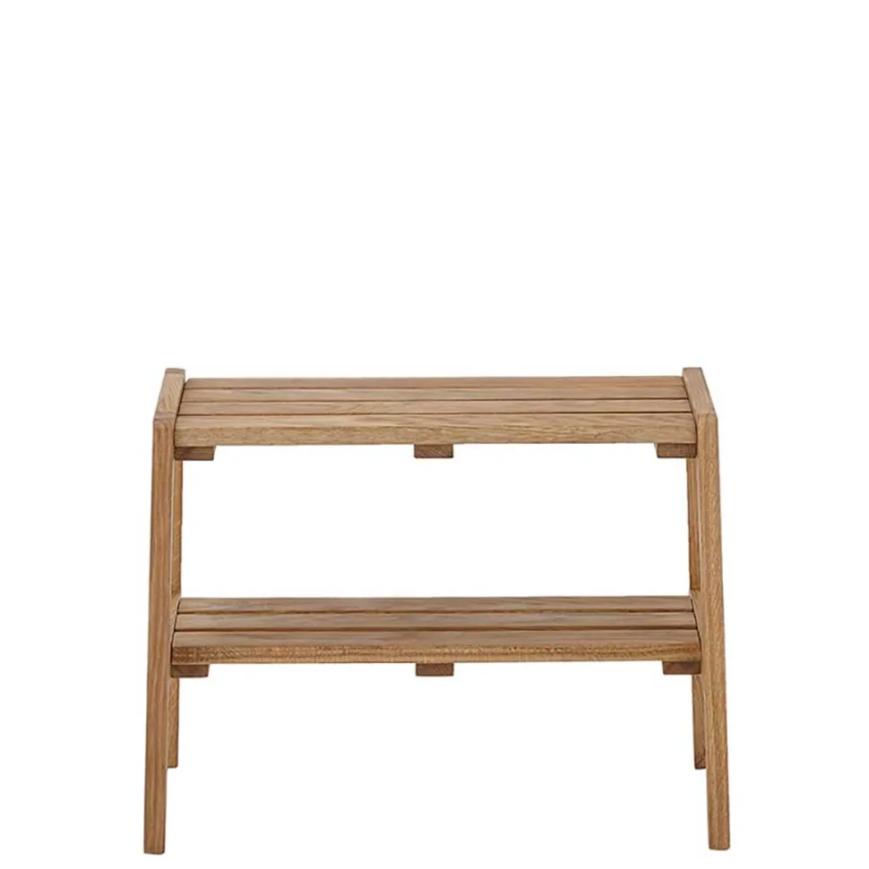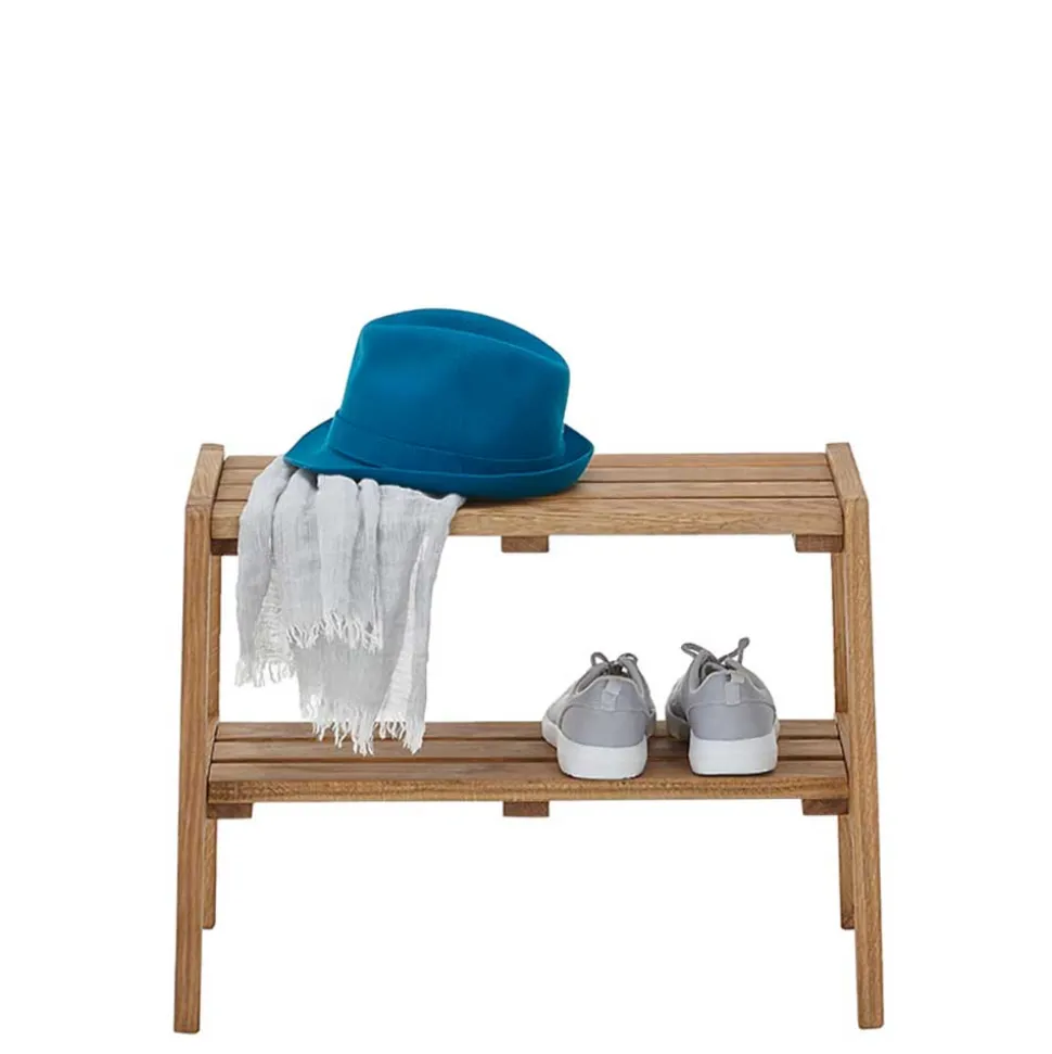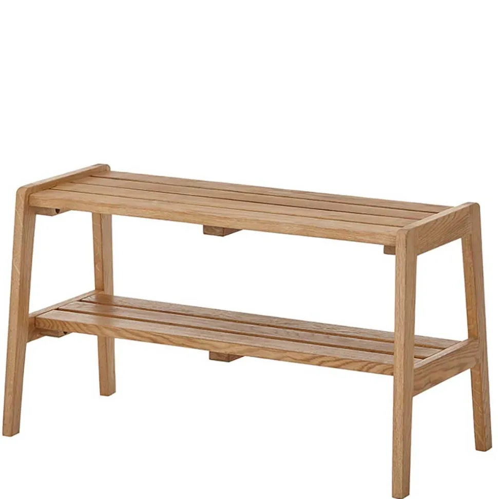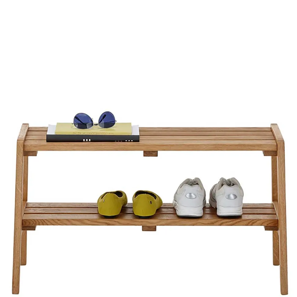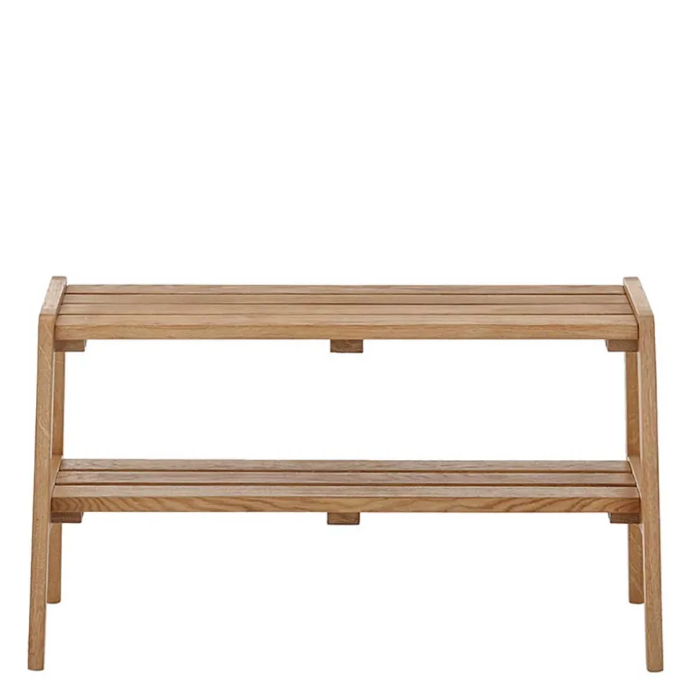 Mit einer Sitzfläche, die aus vier stabilen Holzleisten besteht, bietet die Bank eine bequeme Sitzmöglichkeit für eine Person und trägt ein Gewicht von bis zu 80 kg. Unterhalb der Sitzfläche befindet sich eine zusätzliche Ablage, die ebenfalls aus massiven Holzleisten gefertigt ist und ideal für die Aufbewahrung von Schuhen oder anderen Gegenständen genutzt werden kann. Das Fußgestell in A-Konstruktion sorgt für einen sicheren Stand und verleiht der Bank einen modernen, aber gleichzeitig klassischen Look.