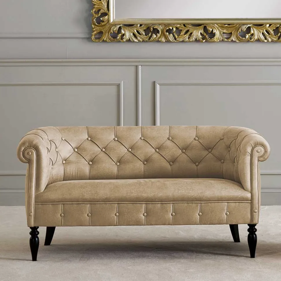 Unser Sofa „Kiano“ präsentiert sich im charakteristischen Chesterfield Look, der durch die aufwendige Knopfsteppung und die kapitionierten Nähte auf der Rückenlehne betont wird. Diese traditionellen Merkmale verleihen jedem Raum eine edle Ausstrahlung. Mit einer Breite von 149 cm, einer Höhe von 73 cm und einer Tiefe von 73 cm findet dieses elegante Möbelstück auch in Ihrem Wohnzimmer perfekt Platz. Der Chesterfield Look steht für eine luxuriöse und elegante Ausstrahlung, die sich durch tief getuftete Polster, runde Armlehnen und eine markante, gleichmäßige Knopfsteppung auszeichnet. Dieses Design ist nicht nur ein Zeichen von Stil, sondern auch ein Symbol für Komfort und Gemütlichkeit.
