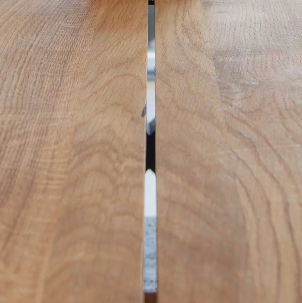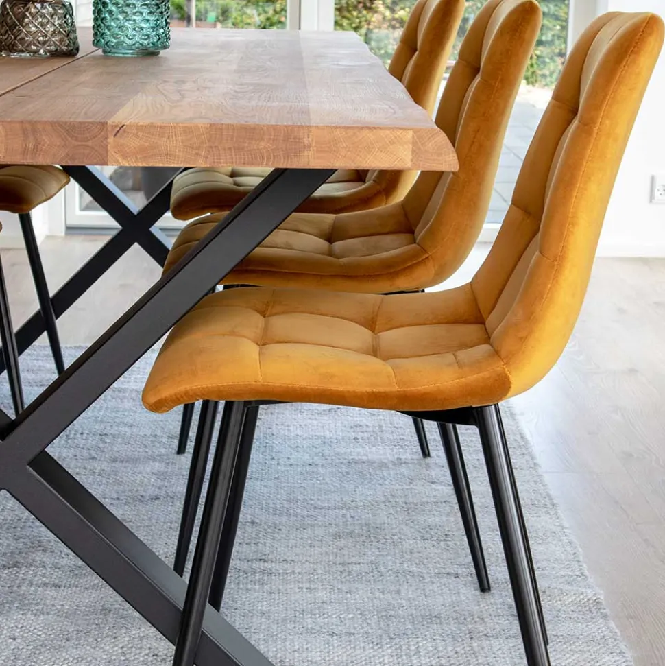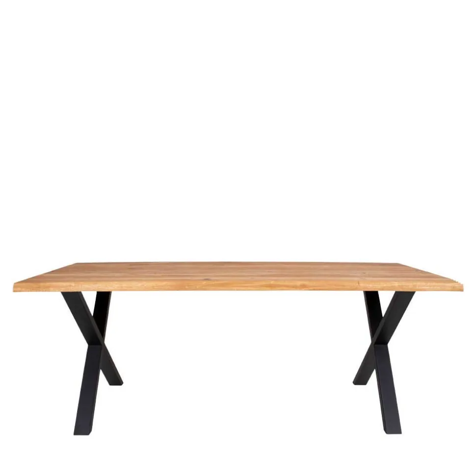 Mit einer Tischplatte aus massivem Eichenholz bringt „Valco“ die Natur in Ihr Esszimmer. Jede Tischplatte ist etwa 4 cm stark und längs geteilt, was nicht nur eine ansprechende Optik, sondern auch ein individuelles Erscheinungsbild bietet. Besonders hervorzuheben sind die einzigartig gewachsenen Baumkanten, die bei jedem Tisch anders verlaufen, da sie direkt aus dem Baumstamm geschnitten werden. Diese Kanten bringen die natürliche Schönheit des Holzes besonders zur Geltung und machen jeden Tisch zu einem echten Unikat. Das X-förmige Stahlgestell in Schwarz sorgt dabei für außergewöhnliche Stabilität und eine interessante Linienführung – ein echter Hingucker, der Design und Funktion perfekt vereint. Diese Konstruktion bietet zudem den Vorteil einer optimalen Gewichtsverteilung und eines sicheren Stands, selbst bei hoher Beanspruchung.