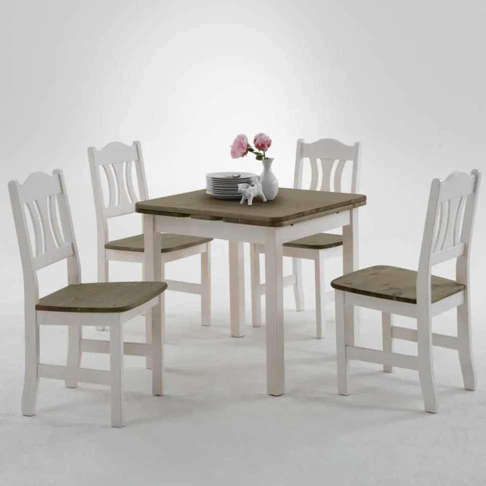 Massives Kiefernholz bildet das Herzstück dieser Möbelserie. Bekannt für seine Stabilität und die natürliche Maserung, bringt Kiefer nicht nur optische Wärme in den Raum, sondern überzeugt auch durch Robustheit und Widerstandsfähigkeit. Die Tischplatte sowie die Sitzflächen der Stühle präsentieren sich in einem eleganten Grauton, während alle weiteren Oberflächen weiß gebeizt und anschließend lackiert wurden.