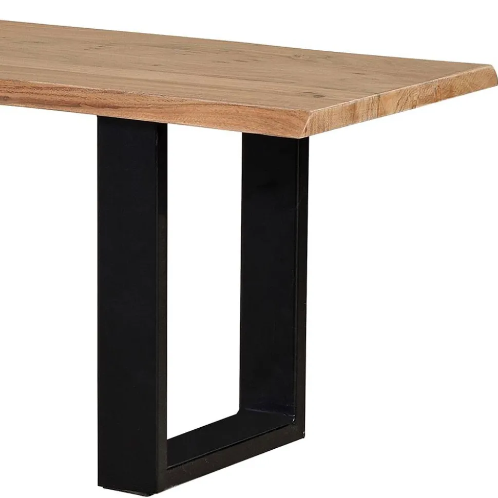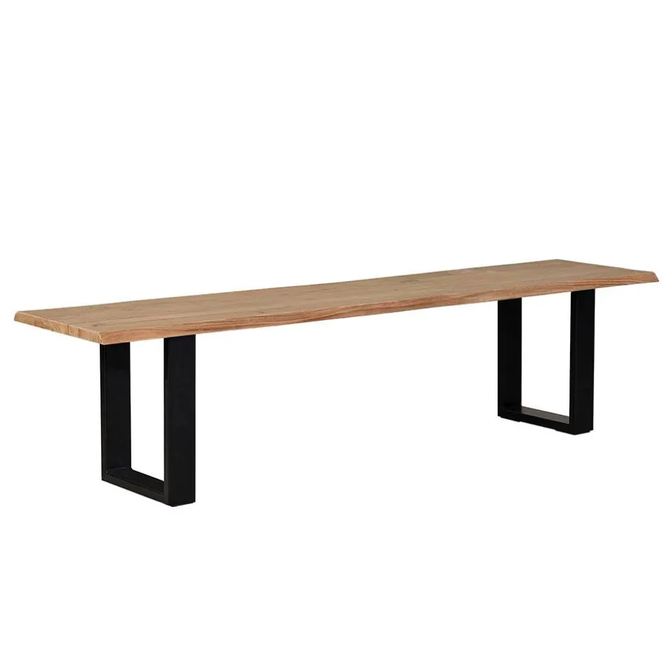 Gefertigt wird die „Calivia“ aus hochwertiger Akazie Massivholz und stabilem Metall. Das Sitzbrett überzeugt durch seine natürliche Maserung und die charakteristischen Baumkanten, die aus dem gewachsenen Stamm herausgeschnitten werden. Dadurch entsteht ein lebendiges, unverwechselbares Erscheinungsbild – jede Bank ist ein handgefertigtes Unikat. Die beiden U-Bügelbeine aus schwarzem Metall sorgen für einen sicheren, stabilen Stand und setzen einen modernen Kontrast zum warmen Holzton.