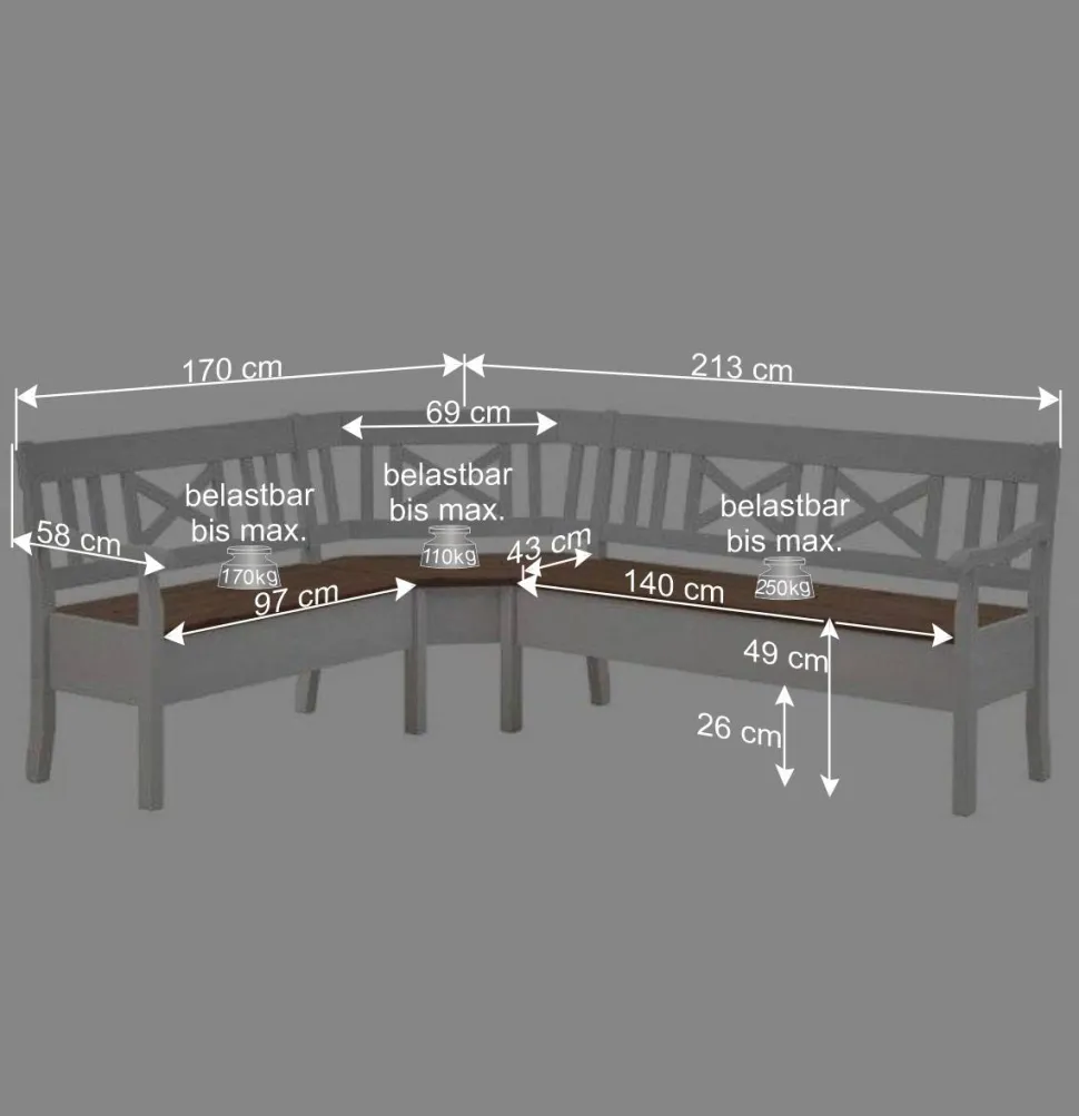 Die stilvolle Rückenlehne mit senkrechten Streben und Kreuzelementen verleiht der Bank eine elegante Note. Diese Details machen die Eckbank nicht nur zu einem funktionalen Möbelstück, sondern auch zu einem ästhetischen Highlight in Ihrem Essbereich. Jedes Detail ist durchdacht und trägt dazu bei, dass die Bank sowohl praktisch als auch optisch ansprechend ist. Lassen Sie sich von der Schönheit und dem Charme dieser Bank verzaubern.