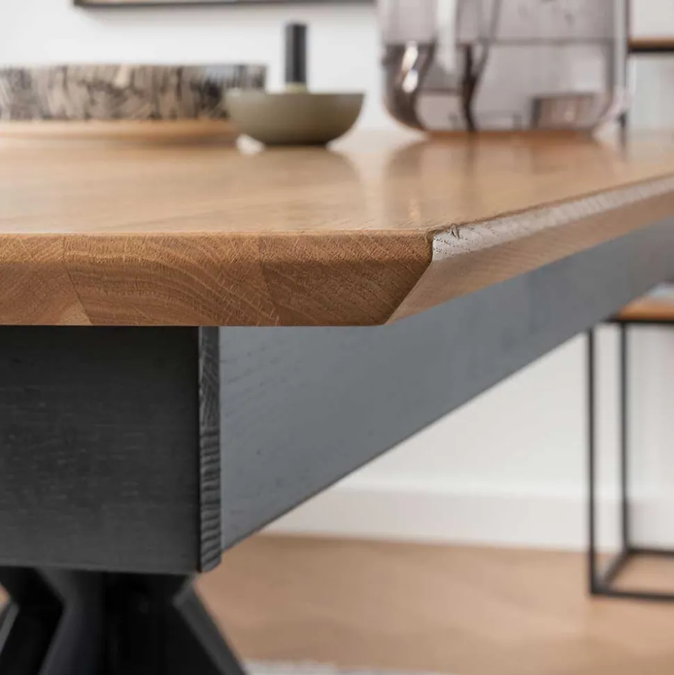 Die Tischplatte, mit einer Stärke von ca. 2,5 cm und durchgehender Lamelle, besticht durch ihre aufwändig gestaltete Schweizer Kante. Diese spezielle Kantenform verleiht dem Tisch zusätzlichen Charakter und eine edle Anmutung.