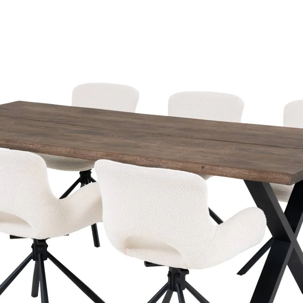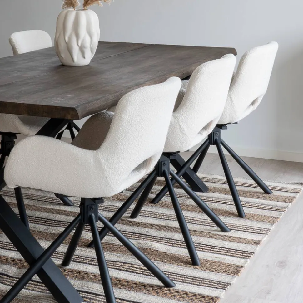 Die sechs mitgelieferten Tischsessel setzen auf Komfort und Flexibilität. Mit einer Sitzhöhe von 48 cm und einer Sitztiefe von 43 cm bieten sie eine angenehme Sitzposition, die durch die leicht nach hinten geneigte Rückenlehne mit dekorativem Ausschnitt zusätzlich unterstützt wird. Die Sitzflächen sind mit Polyurethanschaum gepolstert und mit strapazierfähigem Bouclé-Stoff (100 % Polyester) in Offwhite bezogen – ein Material, das nicht nur edel aussieht, sondern auch pflegeleicht ist. Mit einer Scheuertourenfestigkeit von 30.000 nach Martindale sind die Bezüge bestens für den täglichen Gebrauch geeignet. Das schwarze Metallgestell in Stativform sorgt für Stabilität und verleiht den Sesseln eine moderne Silhouette. Besonders praktisch: Jeder Stuhl ist um 360 Grad drehbar – für maximale Bewegungsfreiheit am Tisch.