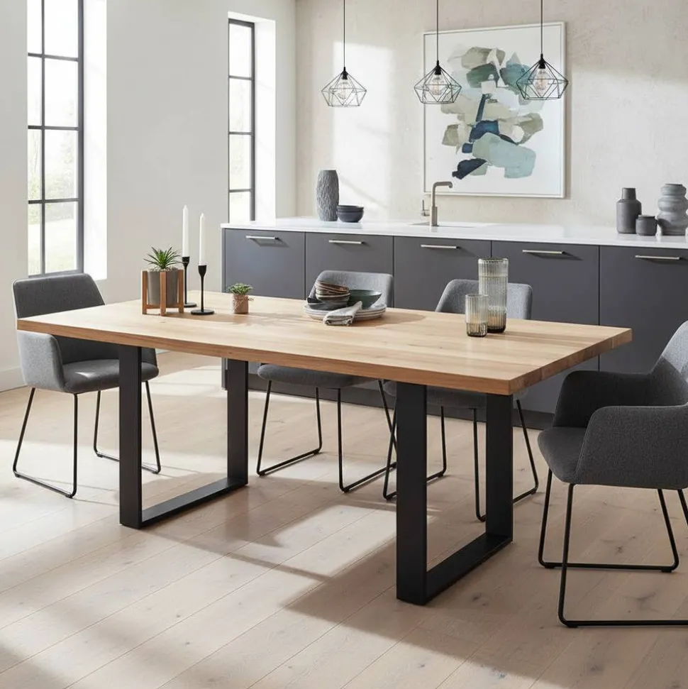 Der Esstisch Theo aus dem Online-Shop Wohnen.de ist der perfekte Treffpunkt für die ganze Familie. Mit seiner fabelhaften Optik in Wildeiche Natur und Schwarz ist er ein echter Blickfang für jeden Essbereich. Der Esstisch ist aus hochwertigem Massivholz Wildeiche und Stahl gefertigt und überzeugt mit seiner robusten und massiven Tischplatte mit einer Stärke von etwa 4 cm. Die Holzoberflächen sind natürlich geölt und so sehr pflegeleicht. Die Tischplatte wird durch schwarz lackierte U-Beine aus Metall Vierkantrohr (je etwa 10×2 cm stark) getragen.