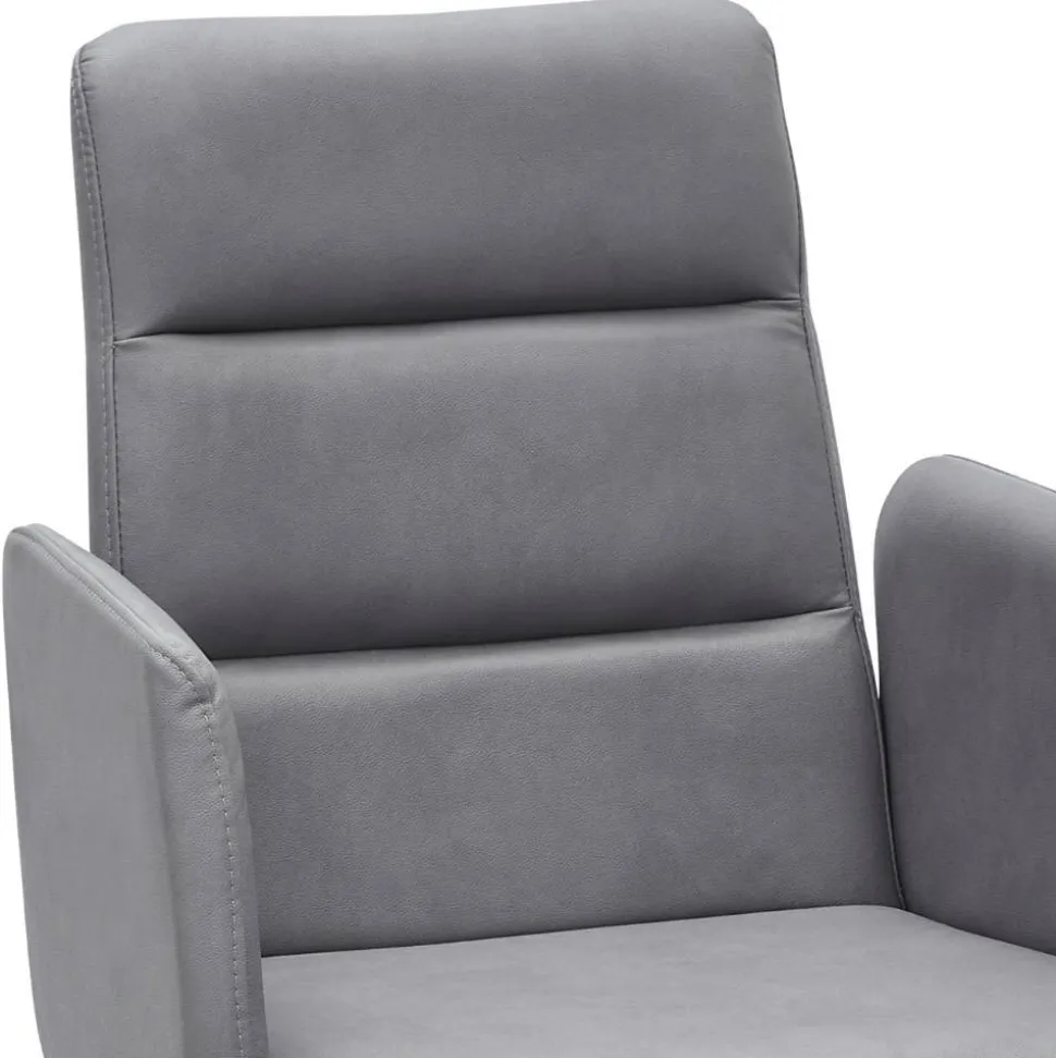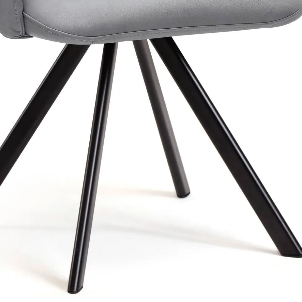 Die leicht geneigte Rückenlehne sorgt für eine entspannte Sitzhaltung, während die komfortablen Armlehnen mit 68 cm Höhe perfekten Halt bieten. Die Rückenlehne ist mit horizontal verlaufenden, tiefen Steppnähten gestaltet – ein dezentes, aber wirkungsvolles Designmerkmal, das den hochwertigen Charakter des Stuhls unterstreicht. Das abgespreizte Metallgestell in mattem Schwarz gibt dem Stuhl nicht nur Stabilität, sondern setzt auch einen modernen Kontrast zum textilen Bezug.