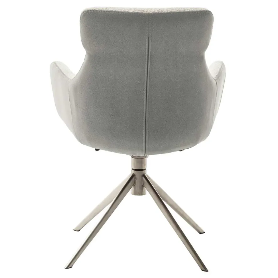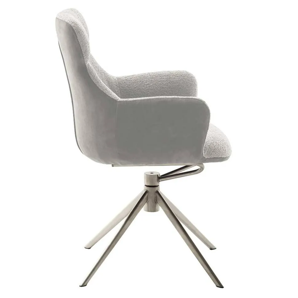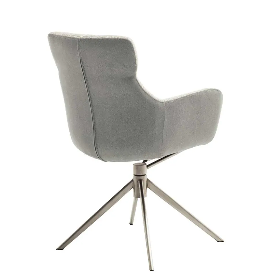 Der Esszimmer-Armlehnenstuhl „Delamaro“ in Lichtgrau verbindet modernes Design mit hohem Komfort. Das Edelstahlgestell verleiht ihm eine stilvolle Eleganz, die jedes Esszimmer bereichert.