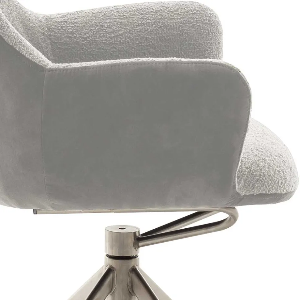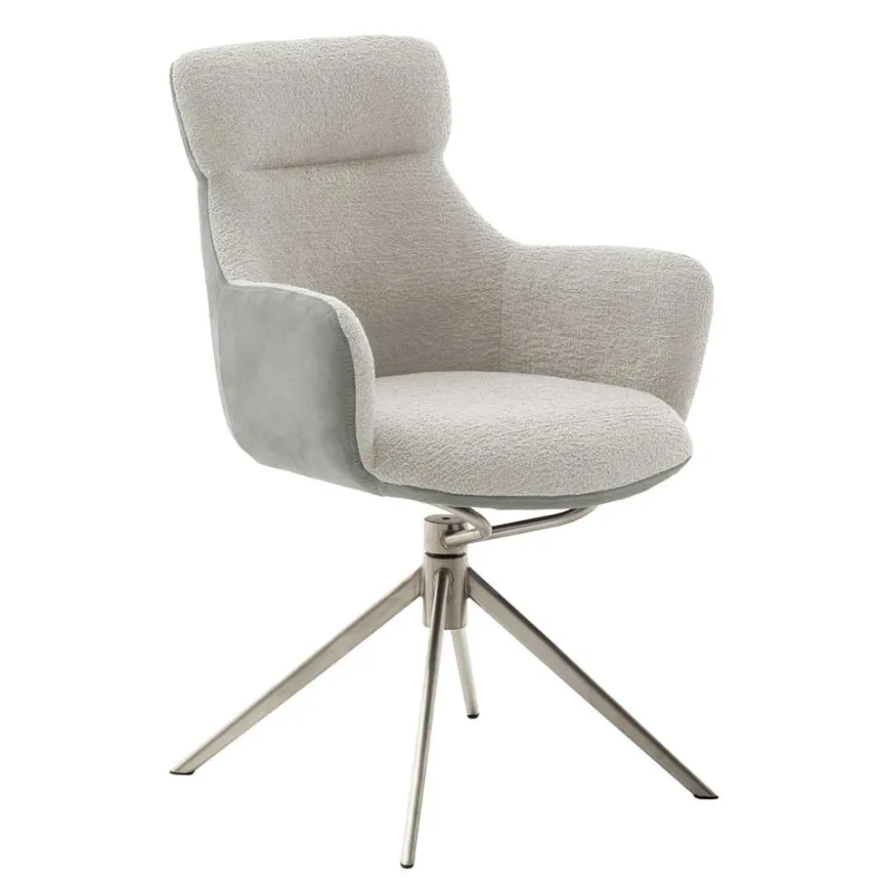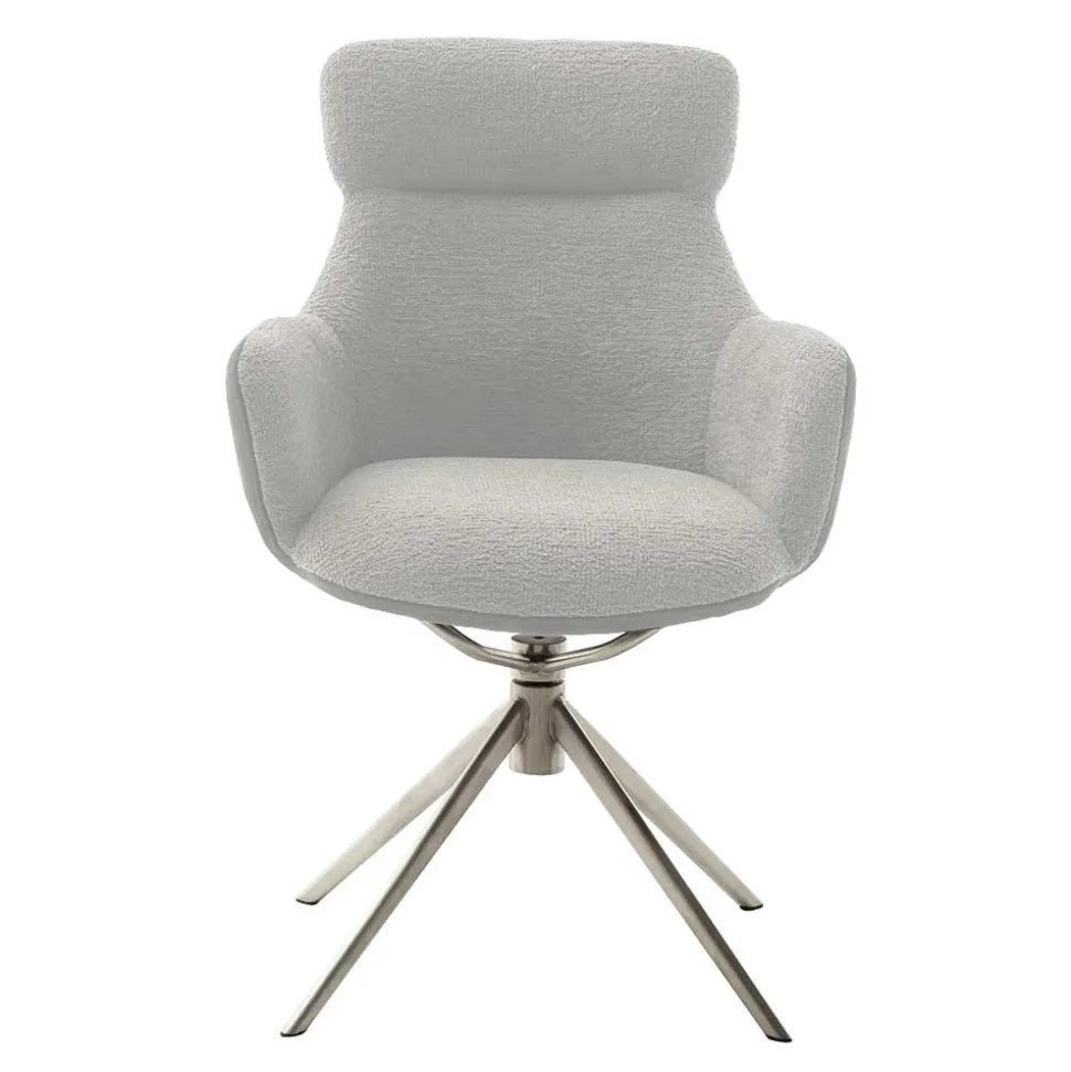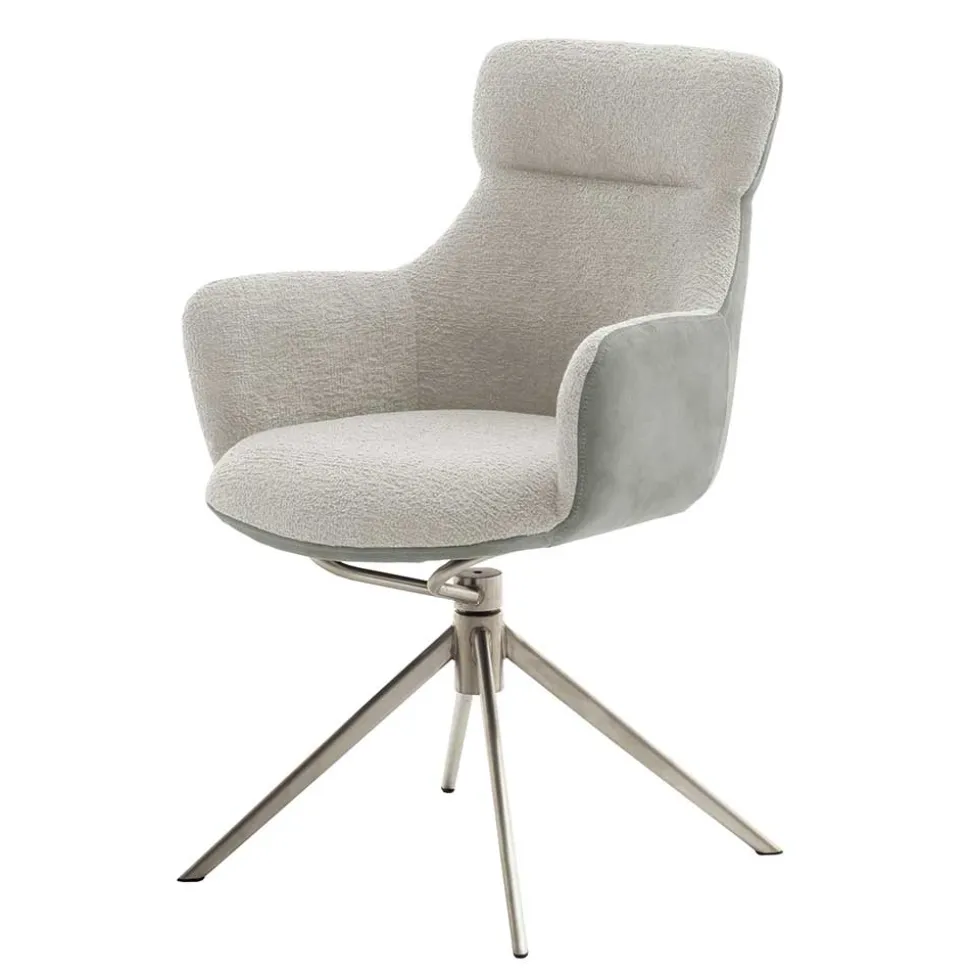 Der Esszimmer-Armlehnenstuhl „Delamaro“ in Lichtgrau verbindet modernes Design mit hohem Komfort. Das Edelstahlgestell verleiht ihm eine stilvolle Eleganz, die jedes Esszimmer bereichert.