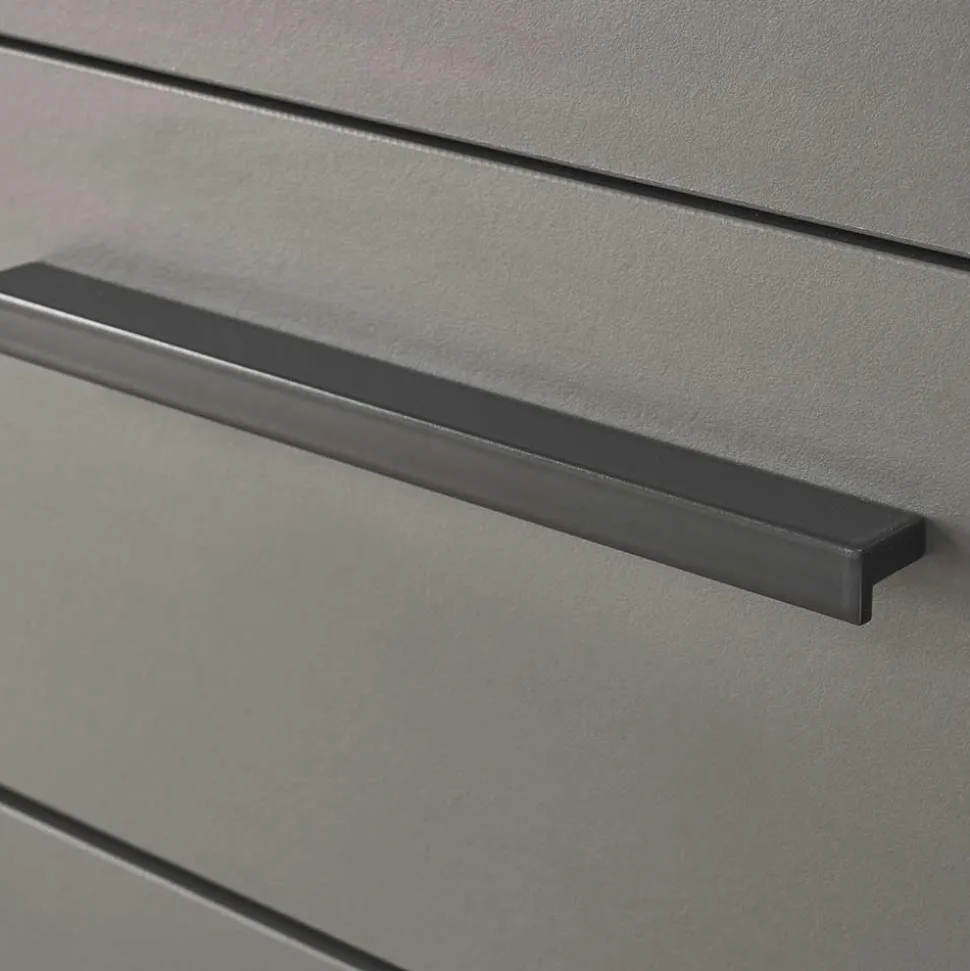 Hochwertige Materialien für dauerhafte Qualität Die Möbel der Serie „Mundo“ bestehen aus einem hochwertigen Holzwerkstoff in Verbindung mit stabilen Metallelementen. Holzwerkstoff bietet eine hohe Formstabilität, ist widerstandsfähig gegen Verformung und sorgt für eine lange Lebensdauer der Möbel. Die melaminbeschichtete Oberfläche in Holzoptik und Anthrazit ist nicht nur optisch ansprechend, sondern auch besonders pflegeleicht und strapazierfähig. Dank dieser Beschichtung lassen sich Oberflächen leicht reinigen und sind unempfindlich gegen Kratzer und Flecken – ideal für den Alltag. Schwarze Metall-Griffleisten setzen darüber hinaus einen modernen Akzent und garantieren einfache Handhabung.