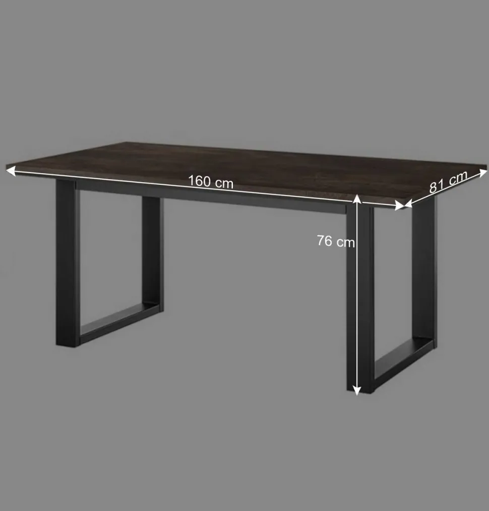 Der Tisch – stabil und zeitlos Mit seinen Maßen von 160x76x81 cm bietet der Esstisch genügend Platz für gemeinsame Mahlzeiten mit Familie und Freunden. Die stabile Tischplatte aus hochwertigem Holzwerkstoff sorgt für Robustheit, während das schwarze Metallgestell in U-Form einen sicheren Stand und eine moderne Note garantiert.
