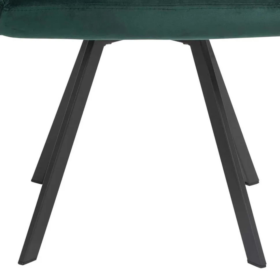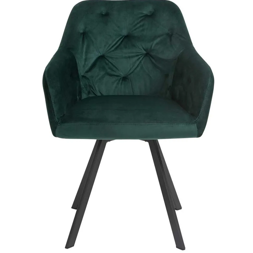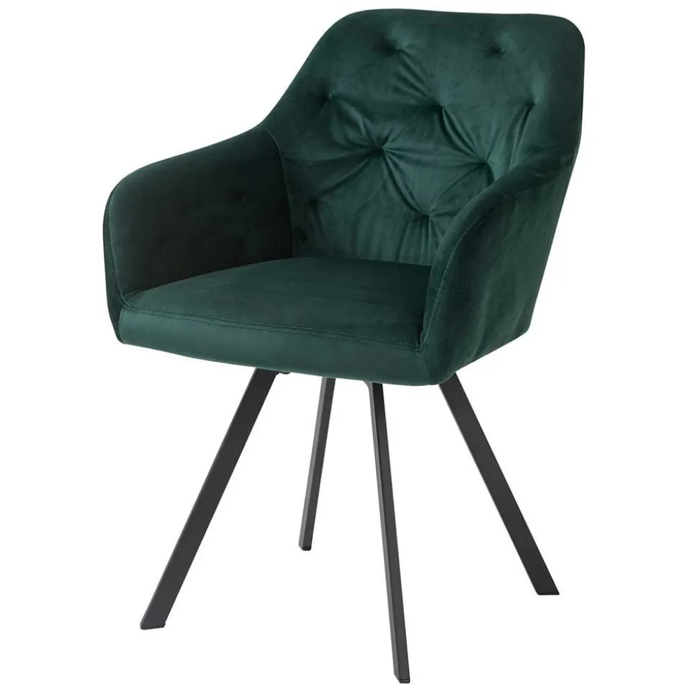 Die ergonomisch geformten Armlehnstühle bieten höchsten Sitzkomfort. Die großzügige Schaumstoffpolsterung sorgt für ein angenehmes Sitzgefühl, während die breite Rückenlehne mit dekorativer Knopfheftung zusätzlichen Halt gibt. Ein besonderes Highlight: Die Sitzfläche ist um 360 Grad drehbar, sodass Sie sich mühelos zur Seite drehen können, ohne den Stuhl zu verrücken. Das abgeschrägte Vierfußgestell aus schwarz pulverbeschichtetem Metall garantiert Stabilität und ist bis zu 110 kg belastbar.
