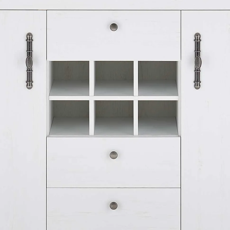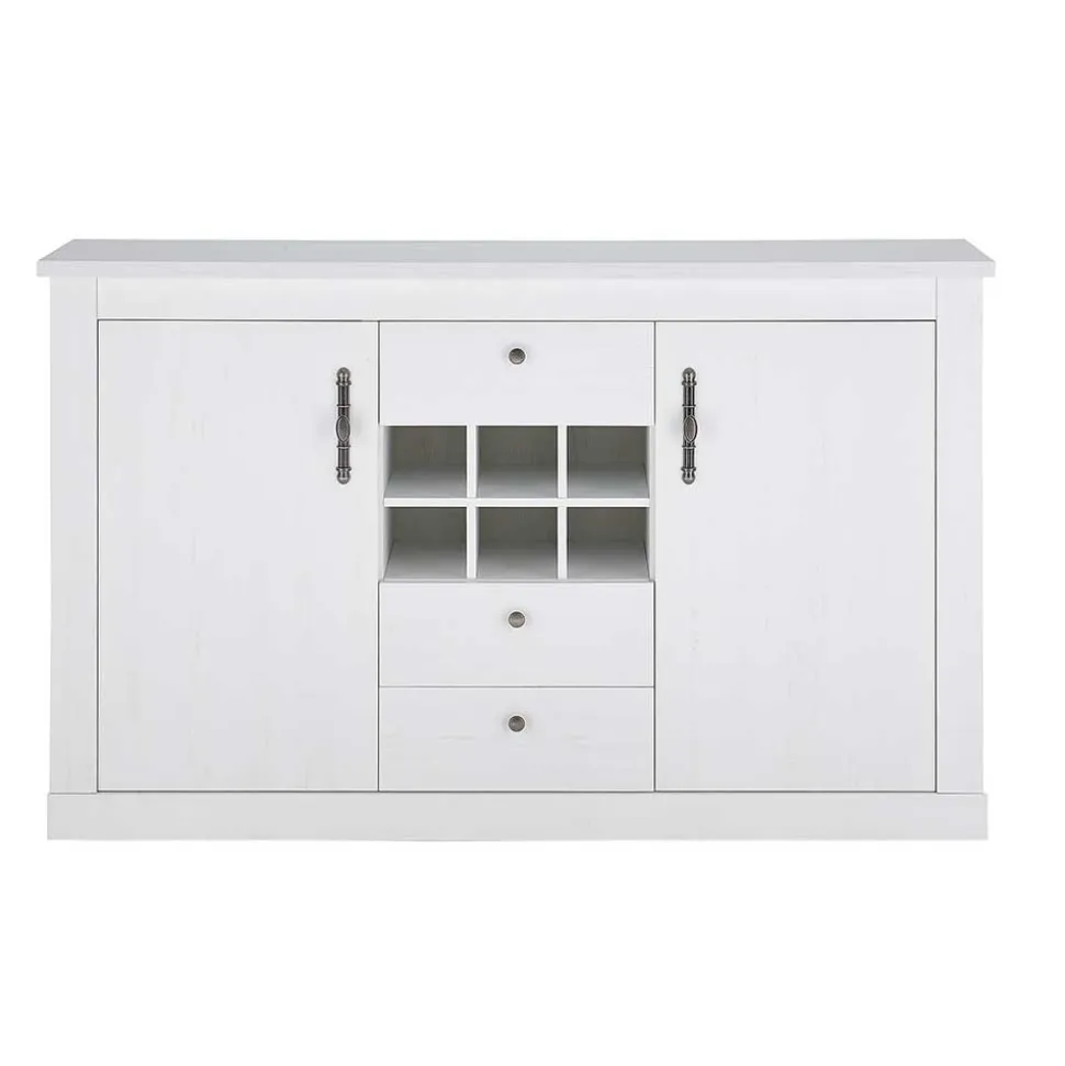 Gefertigt aus robustem Holzwerkstoff, bieten die Möbel der Serie „Liancos“ nicht nur Stabilität, sondern auch pflegeleichte Oberflächen. Die Melaminbeschichtung in Pinie Weiß sorgt für eine ansprechende Holzoptik, die zugleich widerstandsfähig und leicht zu reinigen ist. Edle Metall-Knopfgriffe in Altsilber setzen stilvolle Akzente, während die stabilen Metallauszüge und Beschläge dank Soft-Close-Funktion leisen und komfortablen Bedienkomfort gewährleisten.