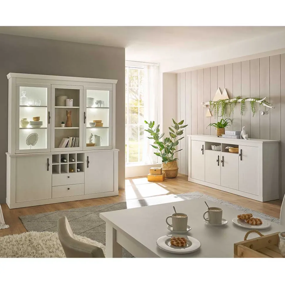Verleihen Sie Ihrem Zuhause einen wohnlichen Charme mit dem Esszimmerschränke Set „Liancos“. Die Holzoptik in Pinie Weiß schafft eine angenehme, helle Atmosphäre, die zu einer Vielzahl von Einrichtungsstilen passt. Das zweiteilige Set, bestehend aus einer Buffetschrank-Vitrine und einem Sideboard, bietet nicht nur ästhetischen Mehrwert, sondern überzeugt auch mit funktionaler Raffinesse. Im beliebten skandinavischen Design gefertigt, fügt sich „Liancos“ nahtlos in Esszimmer, Wohnzimmer oder geräumige Küchen ein und schafft dabei eine perfekte Kombination aus Stil und Stauraum.